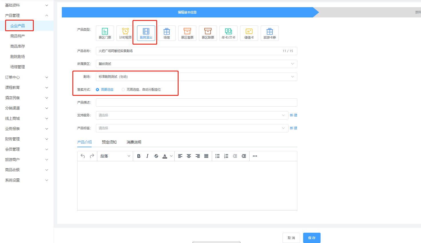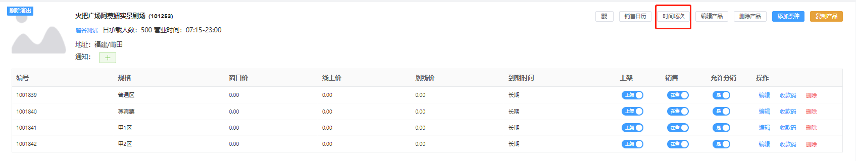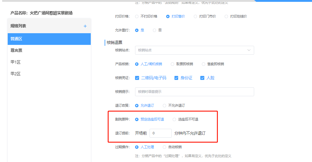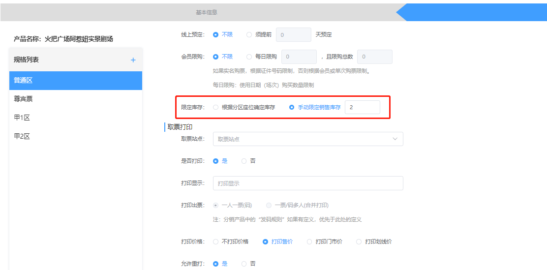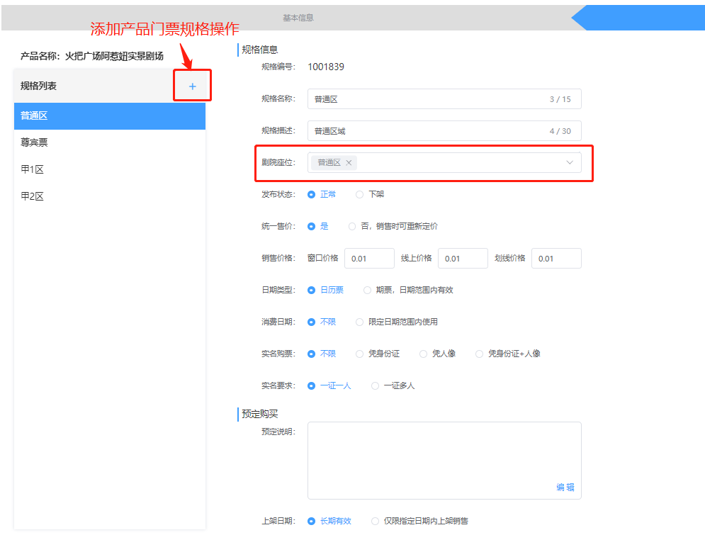 ## 一、建立剧院产品 【发布新产品】选择【剧院演出】填写信息保存,跳转到票种信息页面  **剧场:**选择该剧院的剧场(上面步骤有教怎么建立剧场) **售卖方式:**选择【需要选座】购买的时候手动选择需要的座位,选择【无需选座,自动分配座位】购买的时候系统自动分配座位 **剧院座位:**选择建立剧场的时候新建的座位区域   限定库存: - 【根据分区座位确定库存】:根据剧院区域确定库存。 - 【手动限定销售库存】:设置区域限定的座位库存(例如该区域有100个职位,只销售50个,那么就填写50)  **退订提前:**设置该剧院开场时间内不允许退票 **剧院票种:**【预定选座后可退】:选座之后还可以退单。【选座后不可退】 设置完成之后,点击保存即可 ### 三、剧院的时间段预约 **针对某些场景需要分时间使用,可以进行下面操作设置**