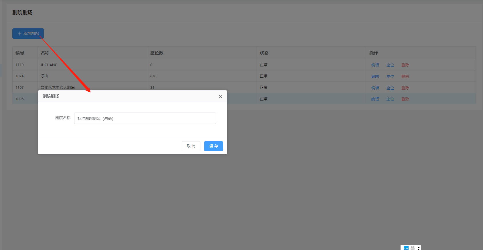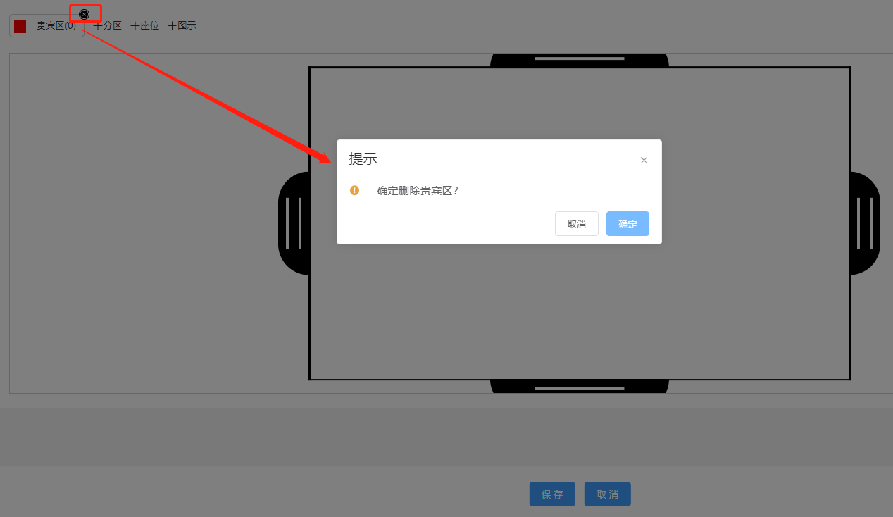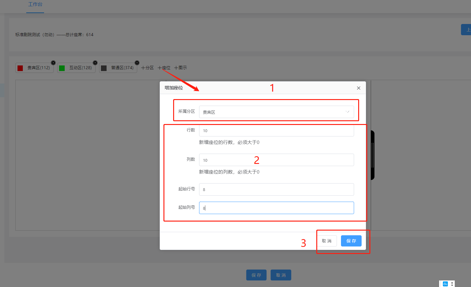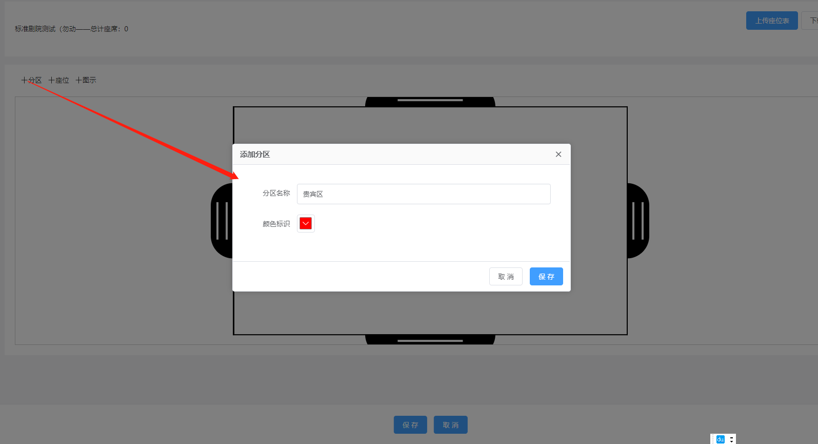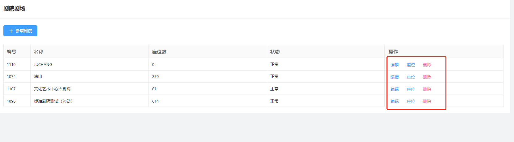 ### 1.新增剧院剧场 登录管理后台,进入“剧院剧场”  点击‘新增剧院’填写相应的名称,点击确定保存剧院/剧场信息。  1、编辑:编辑该剧场的名称。 2、座位:新增该剧场的座位设置。 3、删除:点击‘删除’,确定,该剧场信息删除成功。  ### 2.设置剧院/剧场位置 选择需要设置座位的剧院/剧场,点击‘座位’,跳转到剧院设置座位页面  ### 3.座位分区 设置座位之前需要新建一个座位的区域,然后选择区域的颜色,点击保存  点击区域X标识是删除该区域  双击区域是编辑该区域  ### 4.新增座位 1、所属分区:选择该座位所属的区域 2、行数/列数:设置该座位有多少行座位,多少列座位 3.起始行数/列数:设置该座位起始的行数座位,列数座位  ### 5.图示 建立该剧场的文字标识,对该标识文字、边框的设置(文字大小,颜色),比如建立个标识(舞台中央)点击保存  整体的新建的效果如下,然后点击保存