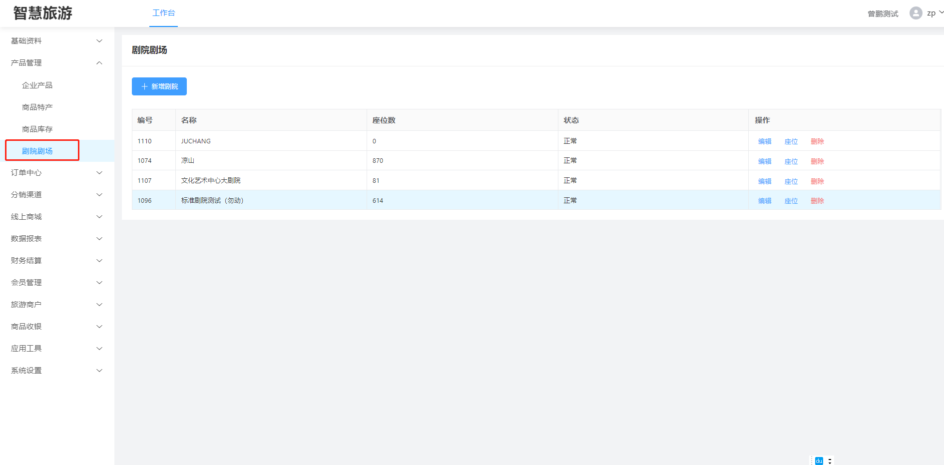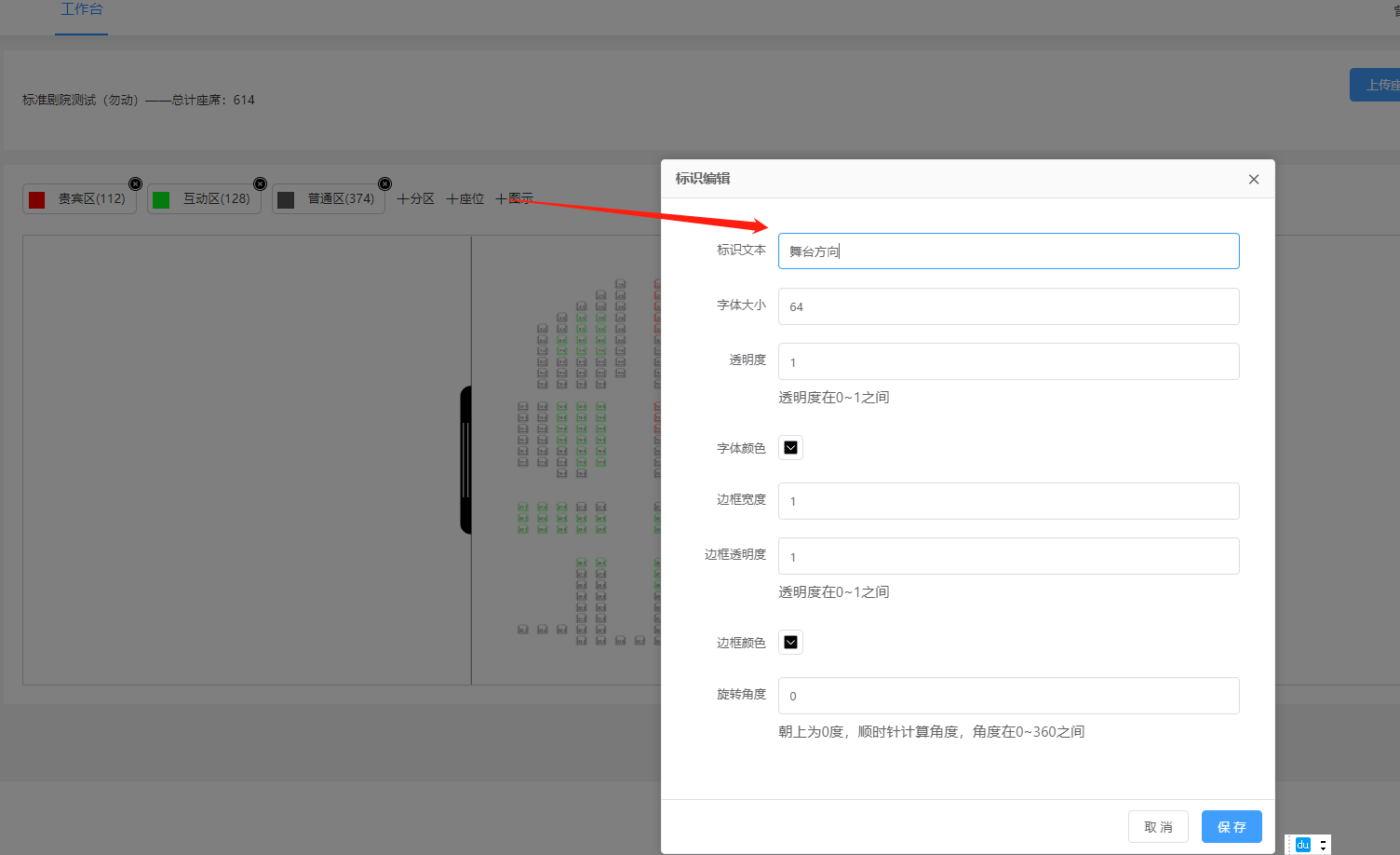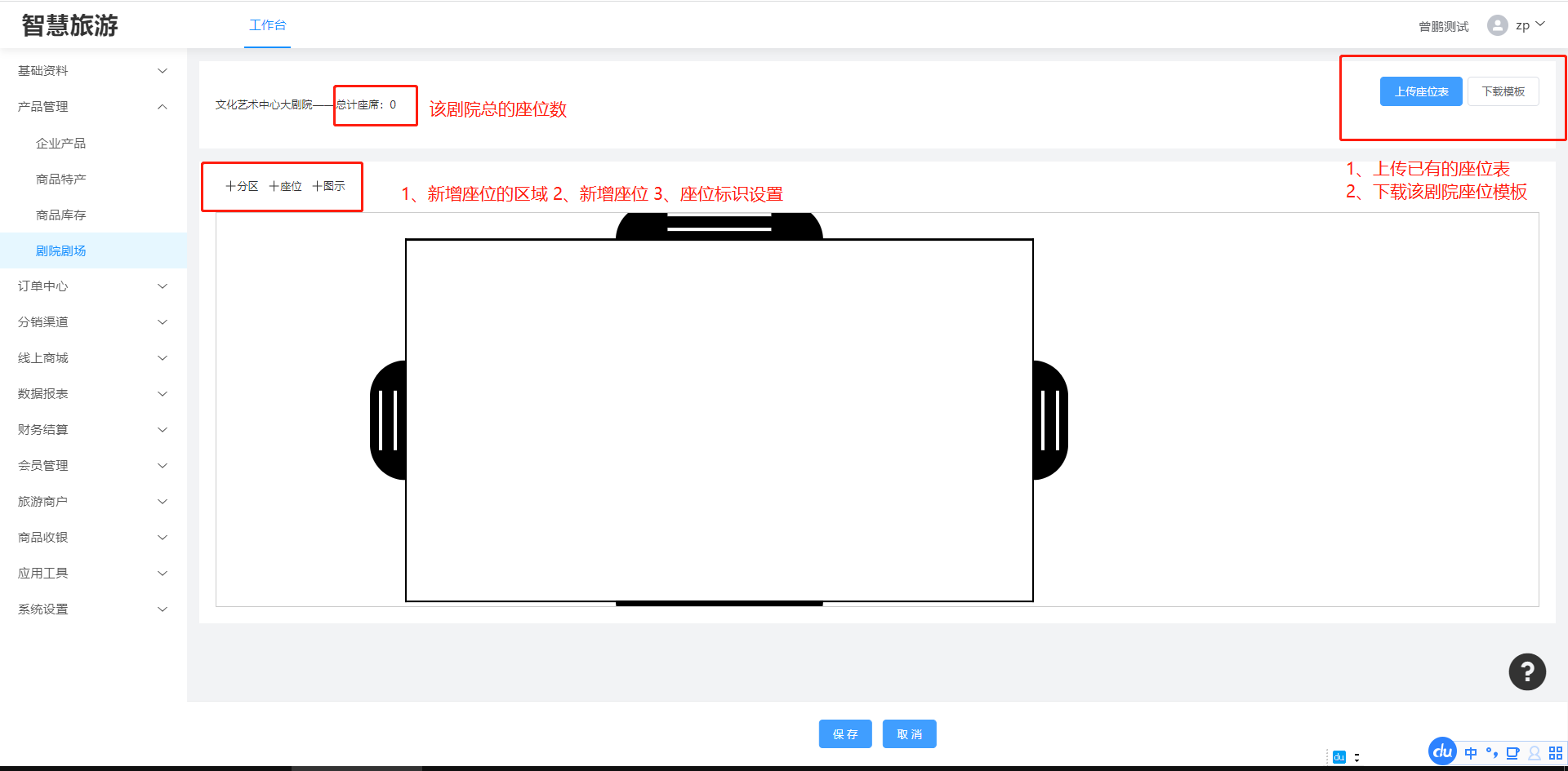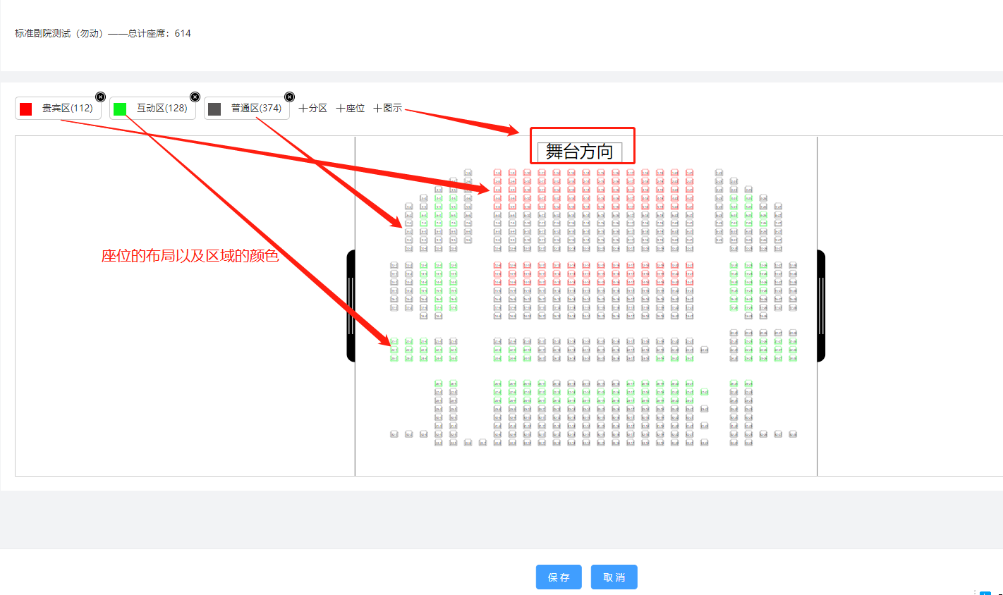 ### 1.新增剧院剧场 登录管理后台,进入“剧院剧场”  点击‘新增剧院’填写相应的名称,点击确定保存剧院/剧场信息。  1、编辑:编辑该剧场的名称。 2、座位:新增该剧场的座位设置。 3、删除:点击‘删除’,确定,该剧场信息删除成功。  ### 2.设置剧院/剧场位置 选择需要设置座位的剧院/剧场,点击‘座位’,跳转到剧院设置座位页面  ### 3.座位分区 设置座位之前需要新建一个座位的区域,然后选择区域的颜色,点击保存  点击区域X标识是删除该区域  双击区域是编辑该区域  ### 4.新增座位 1、所属分区:选择该座位所属的区域 2、行数/列数:设置该座位有多少行座位,多少列座位 3.起始行数/列数:设置该座位起始的行数座位,列数座位  ### 5.图示 建立该剧场的文字标识,对该标识文字、边框的设置(文字大小,颜色),比如建立个标识(舞台中央)点击保存  整体的新建的效果如下,然后点击保存