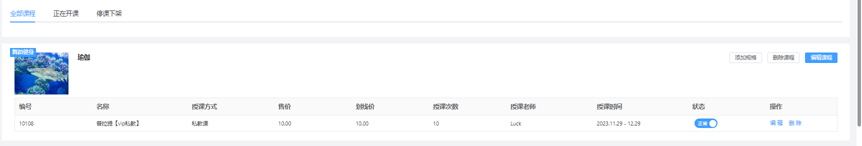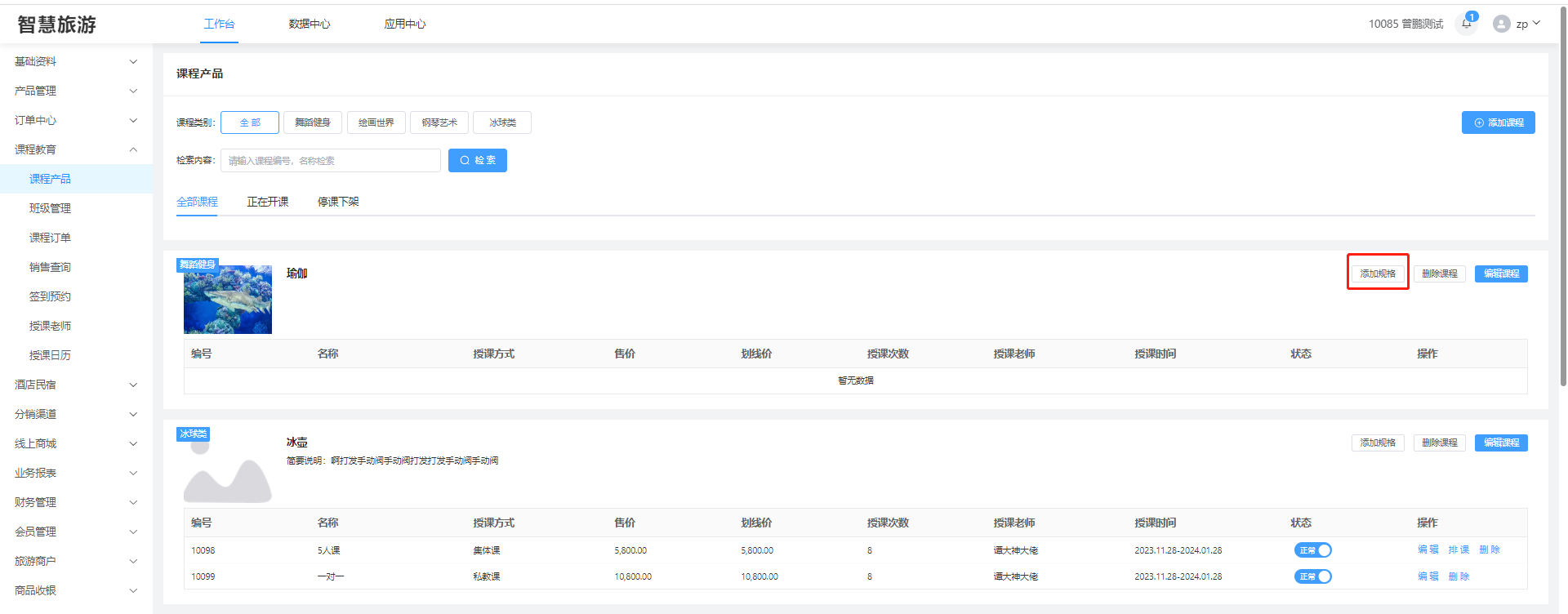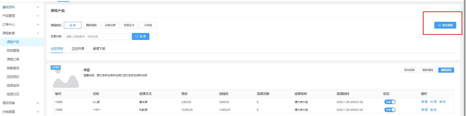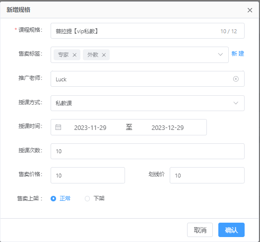 ### 一、发布课程 #### 1、进入“课程产品”  #### 2、点击“添加课程”,填写相应课程名称、类别(课程分组)、课程图片   ### 二、课程规格发布 点击“添加规格”,进入新增规格页面  填写该课程规格信息,选择推广老师,授课时间,价格,点击确认  该规格新增成功