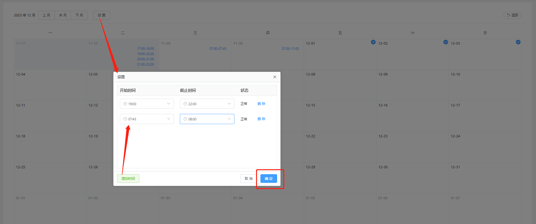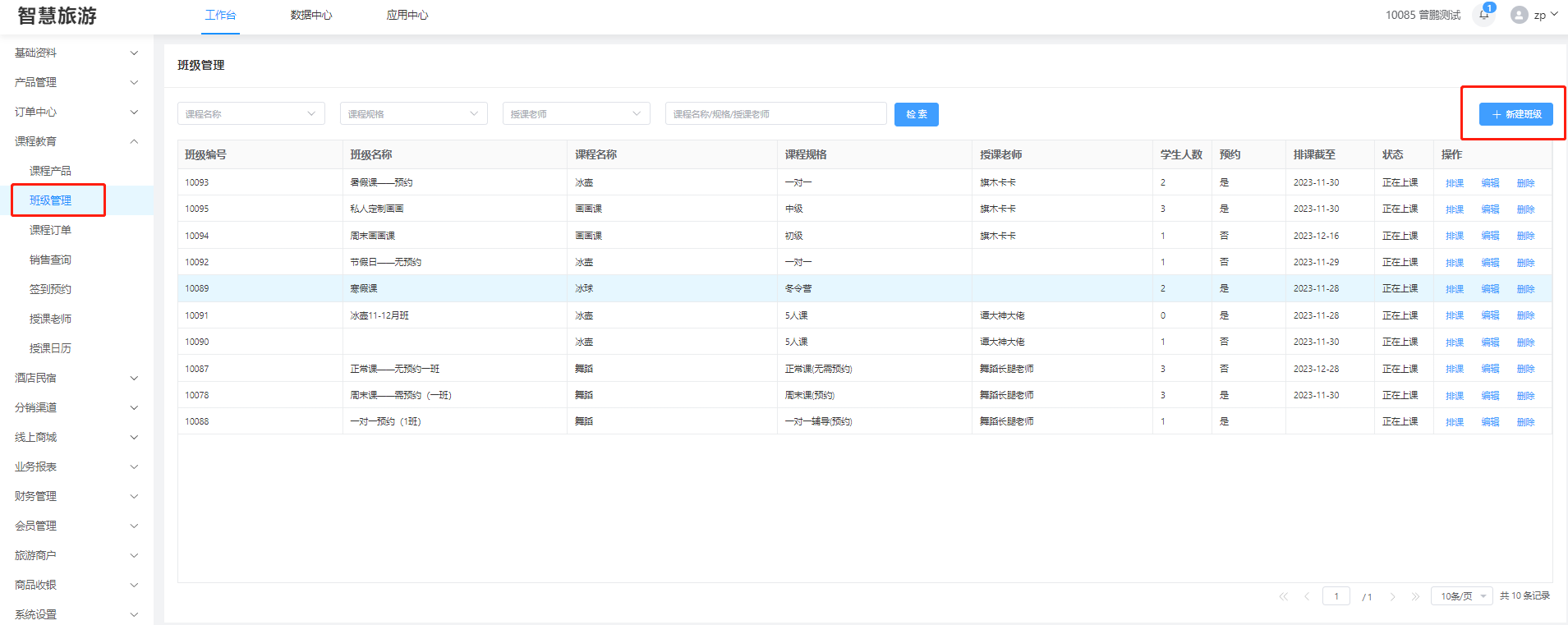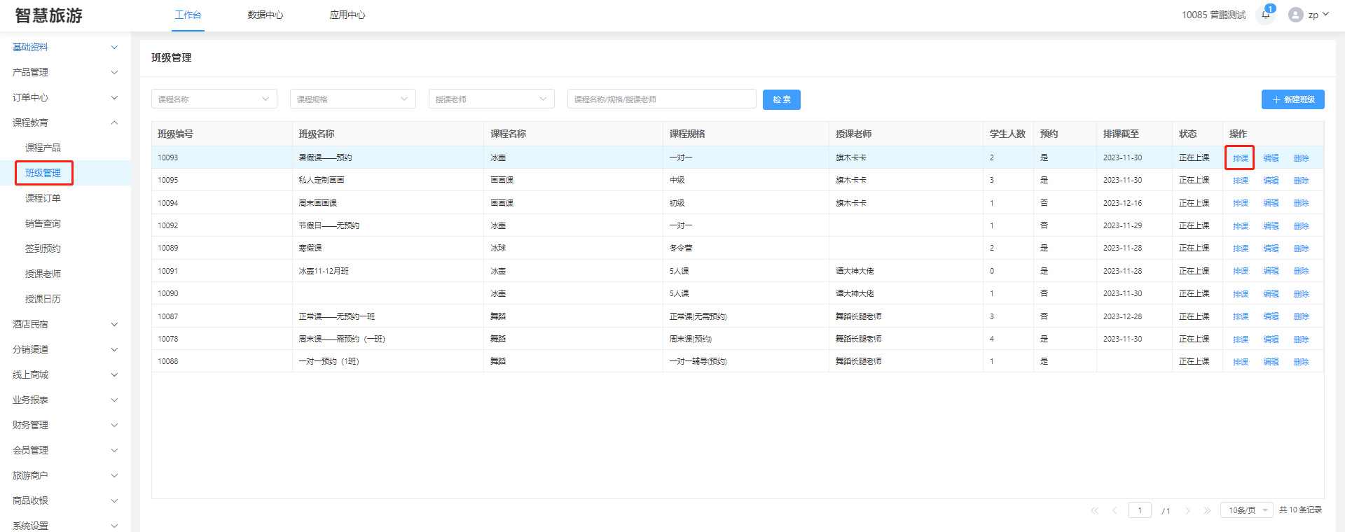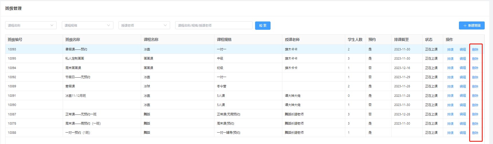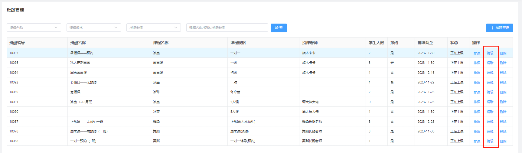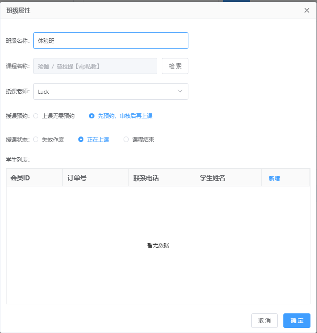 ##### 先创建好班级在为班级进行排课 #### 1、创建班级 进入“班级管理”,点击“新建班级”   其中 授课预约:设置上课是否需要预约,不预约(买完课直接排班就可以上课),预约(买完课排班,在预约才可以上课) 授课状态:设置这个班级是否还在上课中或者是该课程班级结束授课 学生列表:需要把学生排班才能显示 ##### 删除 点击“删除”删除该条班级(已预约或者已开课的删除不了)  ##### 编辑 编辑班级属性信息  #### 2、排课 选择班级,在点击“排课”,进入为该班级排课页面   选中日期,点击左上角“设置”按钮,设置排课时间,点击确定即可