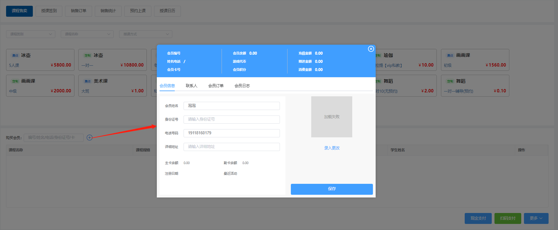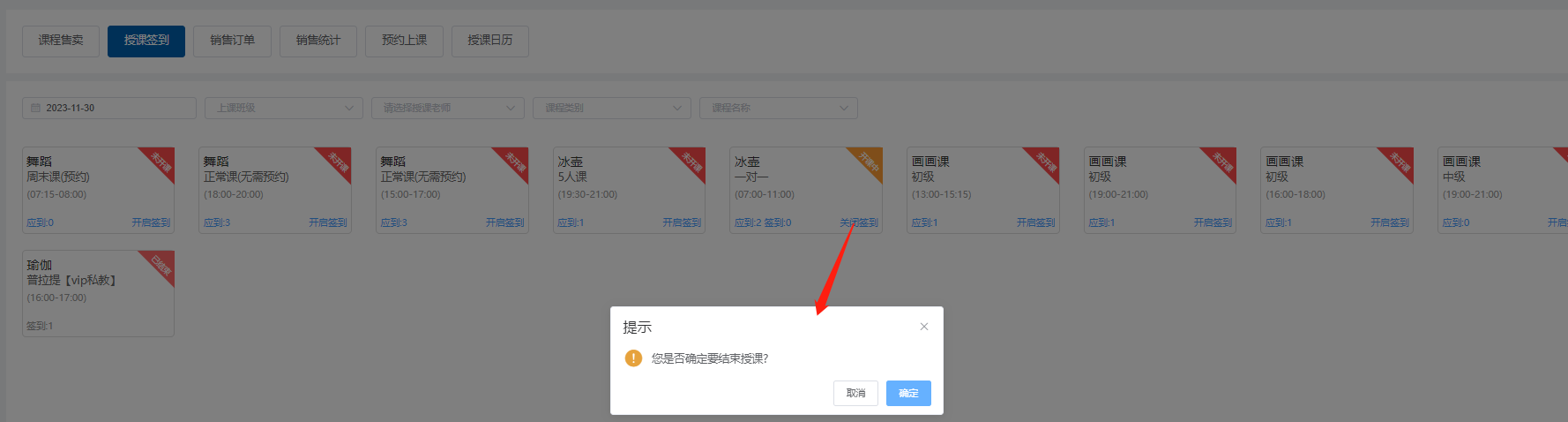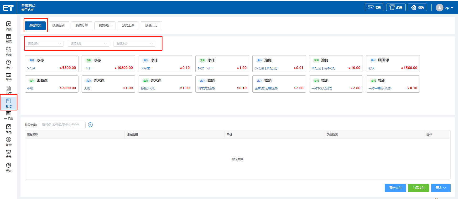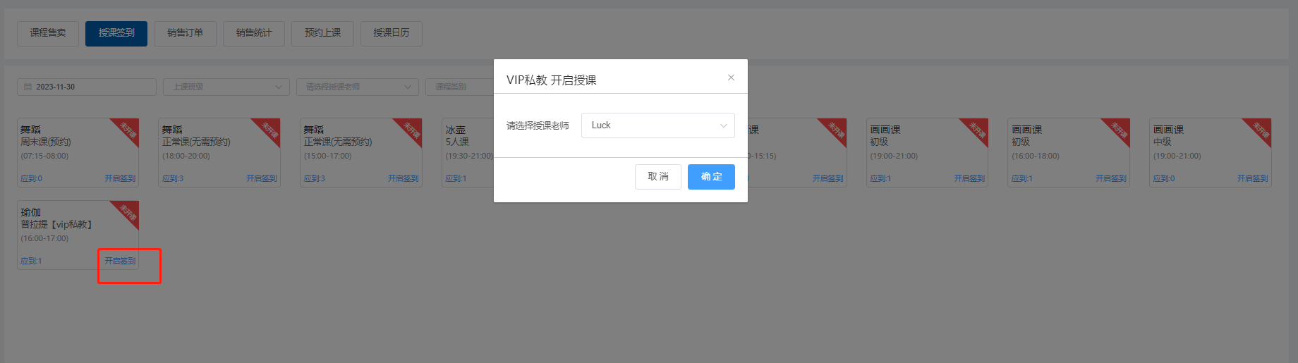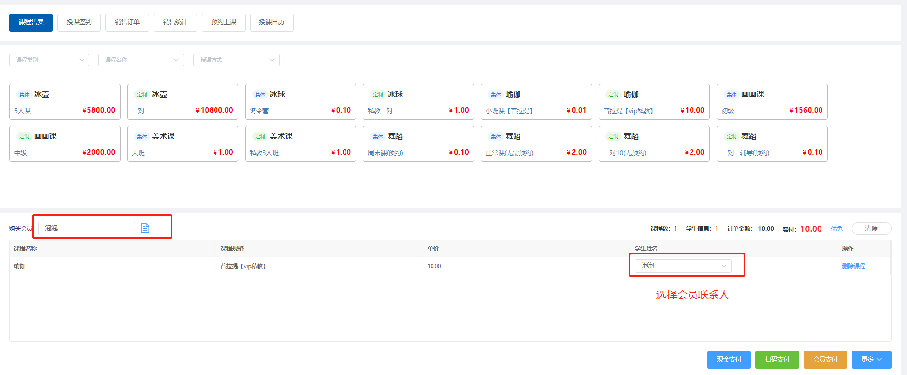## 一、售卖窗口售卖 #### 1、展示售卖课程产品  #### 2、添加会员 ##### 添加一位会员信息,点击保存  ##### 在添加该会员的联系人  #### 3、选择课程产品  #### 4、确定付款  #### 5、排班 ##### 在销售订单中找到该订单,点击“排班”,为该学生排班上课    #### 6、预约上课 ==该操作针对于班级上课需要先预约的,如不需要预约,可以直接跳过该操作,直接签到上课== ##### 班级需要先预约上课制,进入“预约上课”找到该学生,点击“预约”,选择预约方式,点击确定即可   #### 7、授课签到 ##### 进入“授课签到”,会看到该课程的排课,以及该班级排课的应到人数  ##### 老师点击“开启签到”,选择授课老师,点击确定  ##### 点击班级位置进入班级学生签到区域  ##### 点击签到了之后,剩余次数也会相应的减少   #### 关闭签到 ##### 关闭签到说明授课已经结束了  ## 二、小程序上售卖