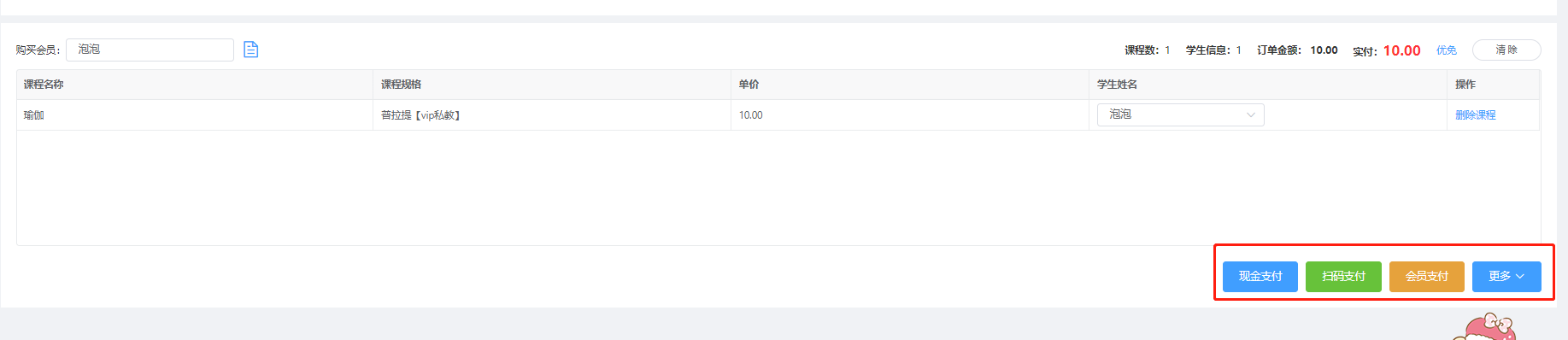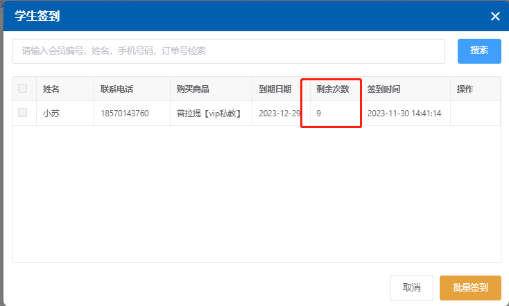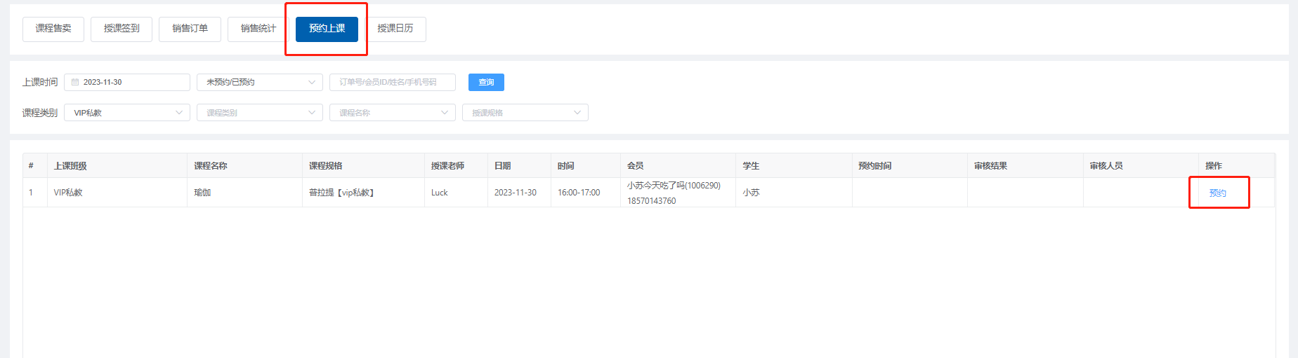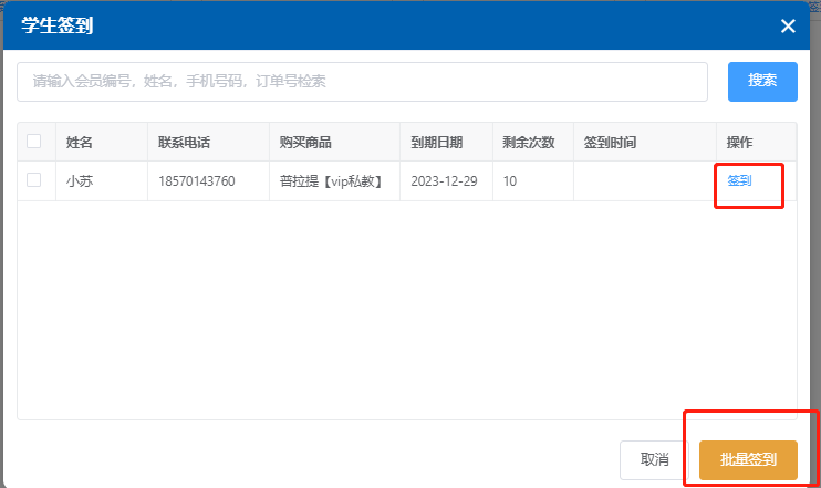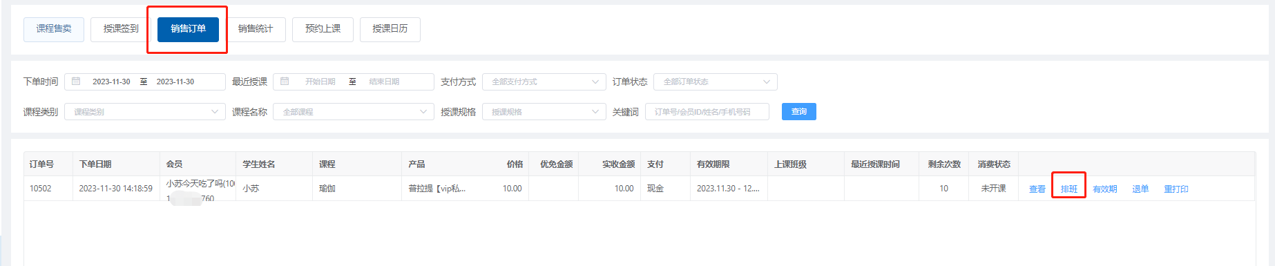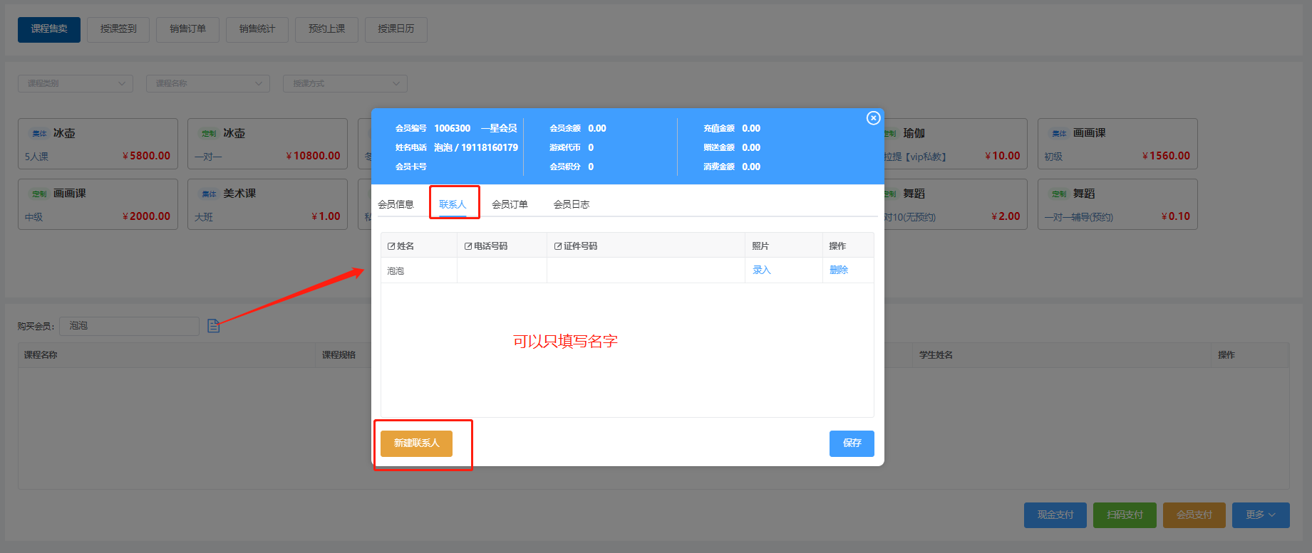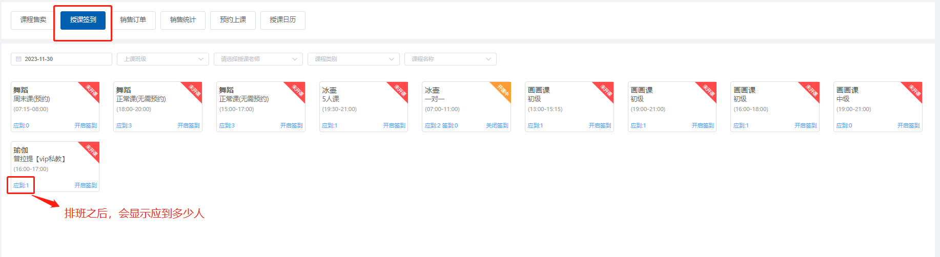 ## 一、售卖窗口售卖 #### 1、展示售卖课程产品  #### 2、添加会员 ##### 添加一位会员信息,点击保存  ##### 在添加该会员的联系人  #### 3、选择课程产品  #### 4、确定付款  #### 5、排班 ##### 在销售订单中找到该订单,点击“排班”,为该学生排班上课    #### 6、预约上课 ==该操作针对于班级上课需要先预约的,如不需要预约,可以直接跳过该操作,直接签到上课== ##### 班级需要先预约上课制,进入“预约上课”找到该学生,点击“预约”,选择预约方式,点击确定即可   #### 7、授课签到 ##### 进入“授课签到”,会看到该课程的排课,以及该班级排课的应到人数  ##### 老师点击“开启签到”,选择授课老师,点击确定  ##### 点击班级位置进入班级学生签到区域  ##### 点击签到了之后,剩余次数也会相应的减少   #### 关闭签到 ##### 关闭签到说明授课已经结束了  ## 二、小程序上售卖