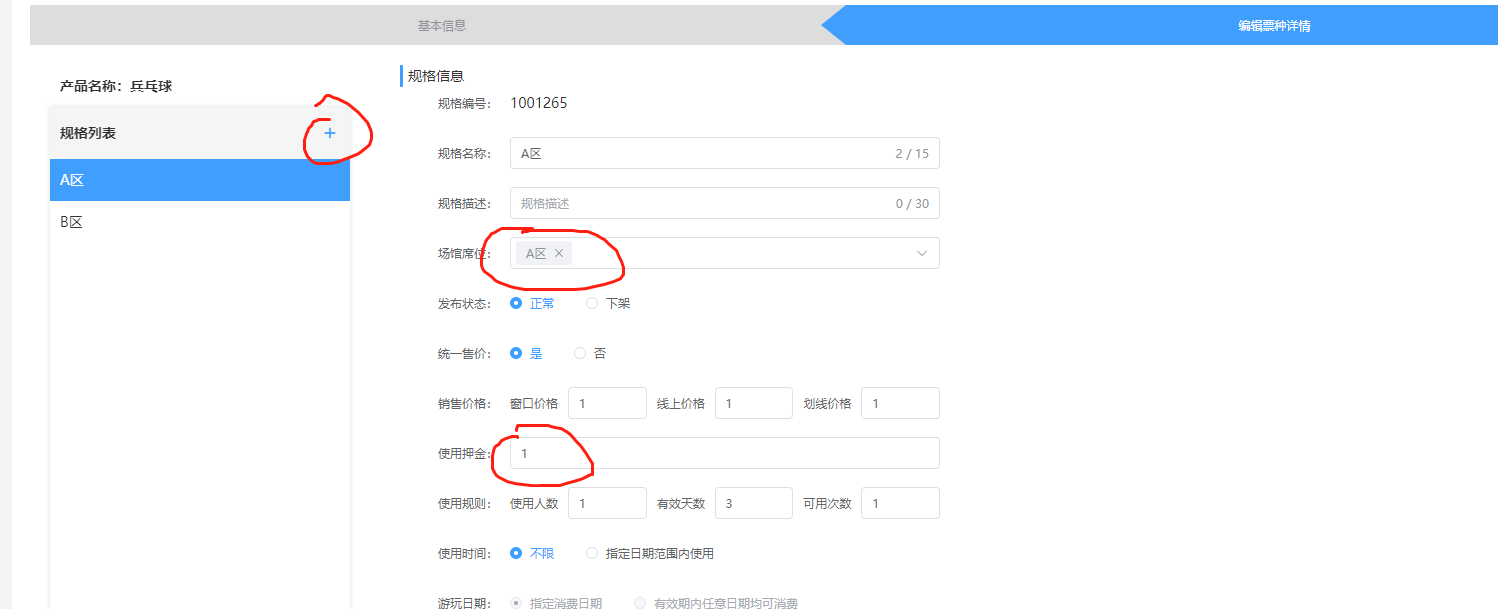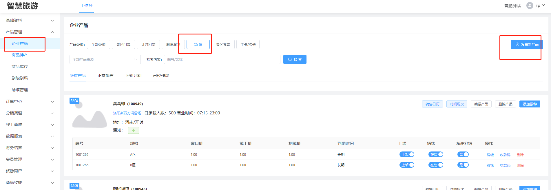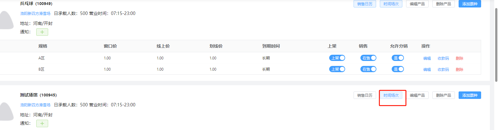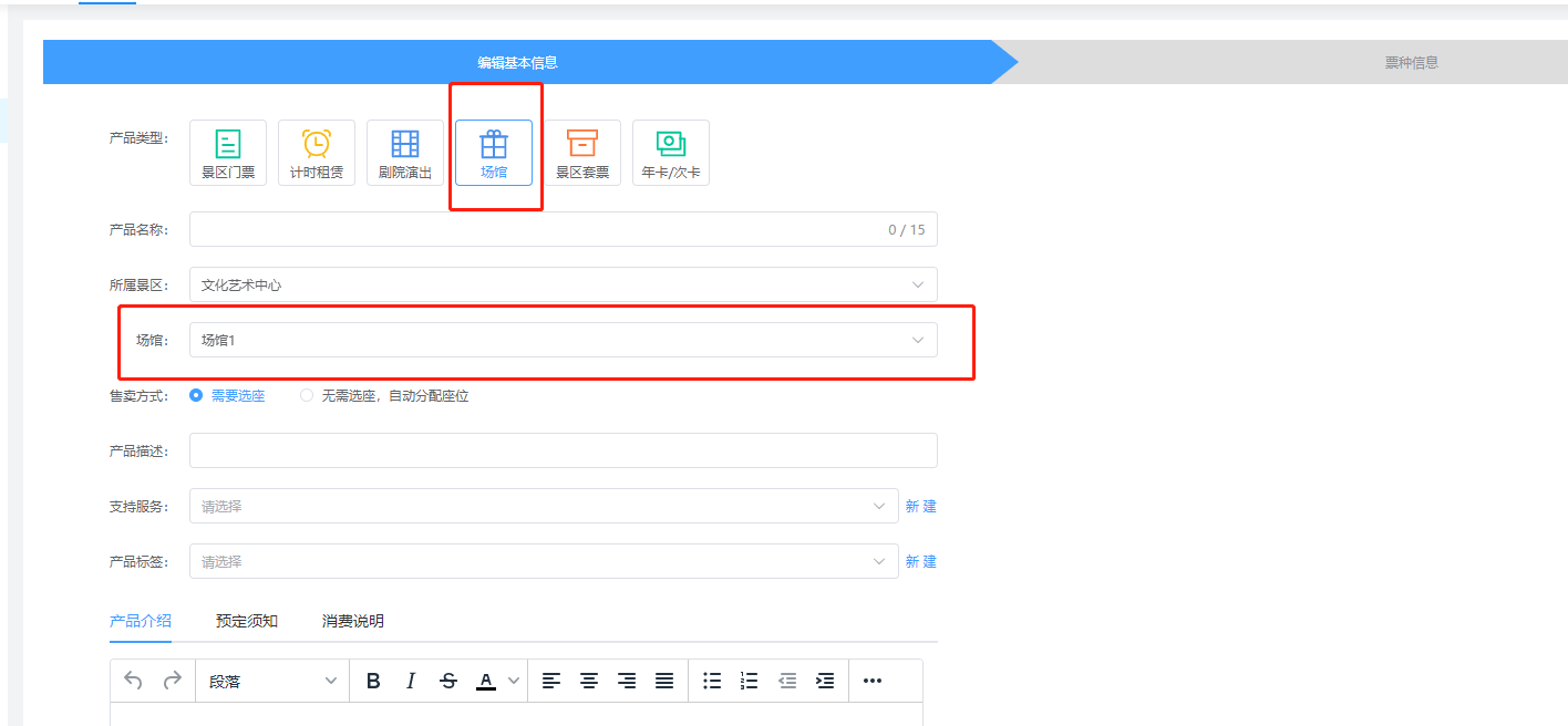 ### 一、进入产品发布模块  ### 二、发布场馆产品  ### 三、发布场馆票种  场馆席位:对于选择场馆示意图中的分区,一个票种可以对应多个场馆分区,不同票种之间的分区可以重叠 使用押金:如果你场馆使用需要押金,请填写押金 **场馆的使用,分入场和离场,你需要选择两次检票核销的方式**  ### 四、场馆的时间段预约 **针对某些场景需要分时间使用,可以进行下面操作设置**