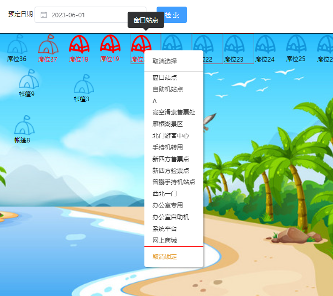 **出于某种原因,场馆的席位需要预留,指定某个销售渠道销售,可以使用该功能** ### 一、进入模块  ### 二、席位展示  > 席位颜色中,红色表示已经预留,灰色表示已经被使用 ### 三、选择席位预留