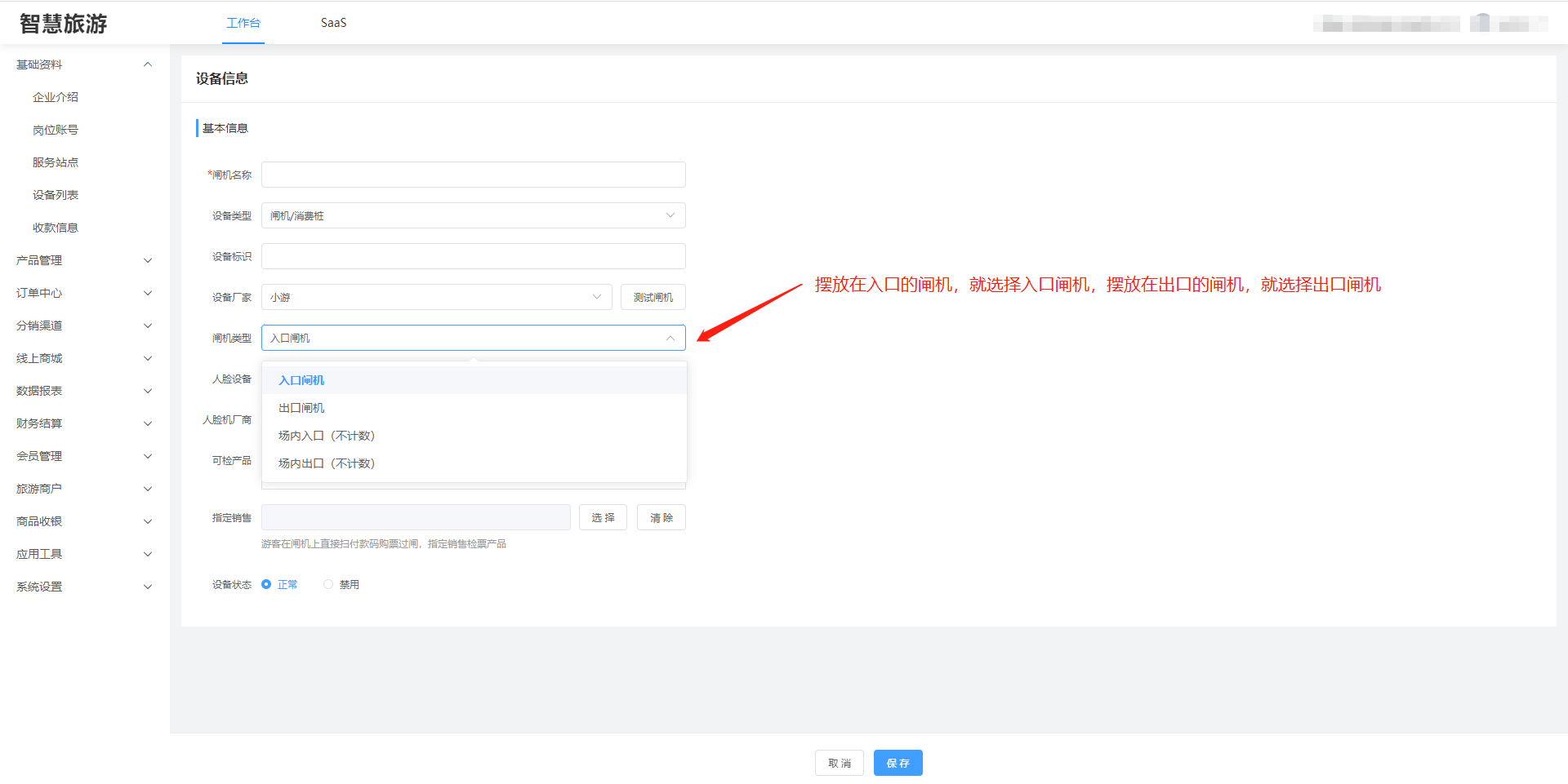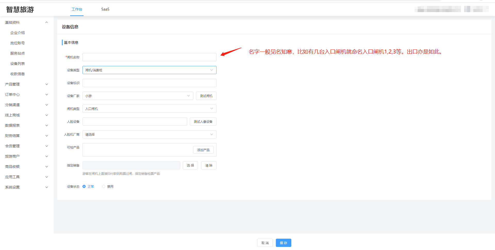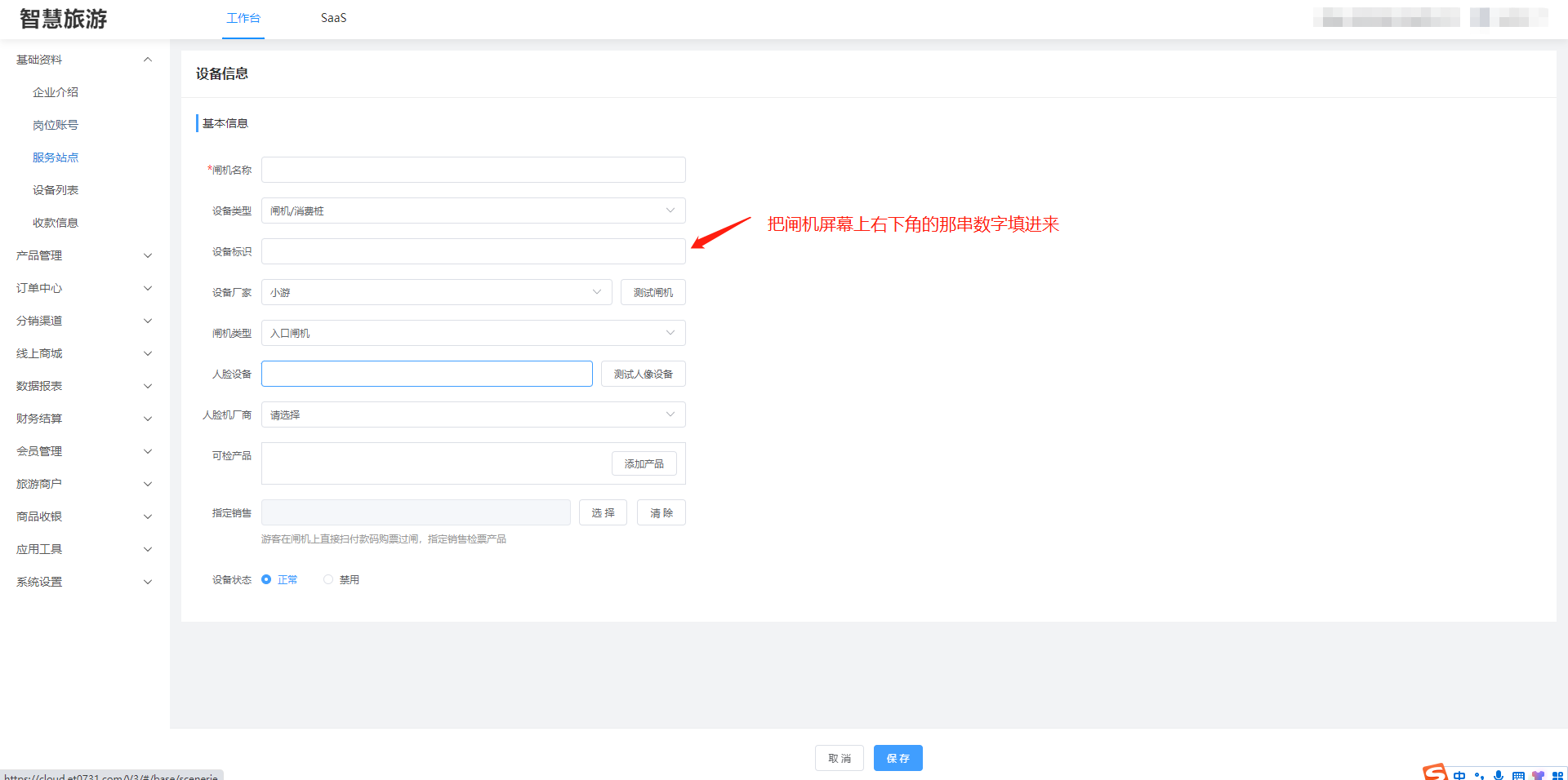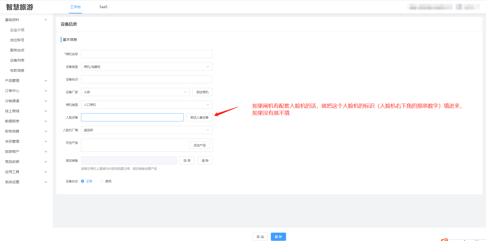 点击基础资料—》设备列表,添加设备  填写闸机的名称  选择对应的设备类型  填写设备标识(也就是闸机屏幕右下角有一串数字)  一般情况下是默认,如果不对就联系小游这边的硬件工程师  摆放着入口的闸机就选入口闸机,放在出口的就选出口闸机  有人脸机的话,就把人脸机右下角那串数字填进来,没有的话就不填  填写完所有的信息以后,一定要记得点下面的保存才能生效!!!