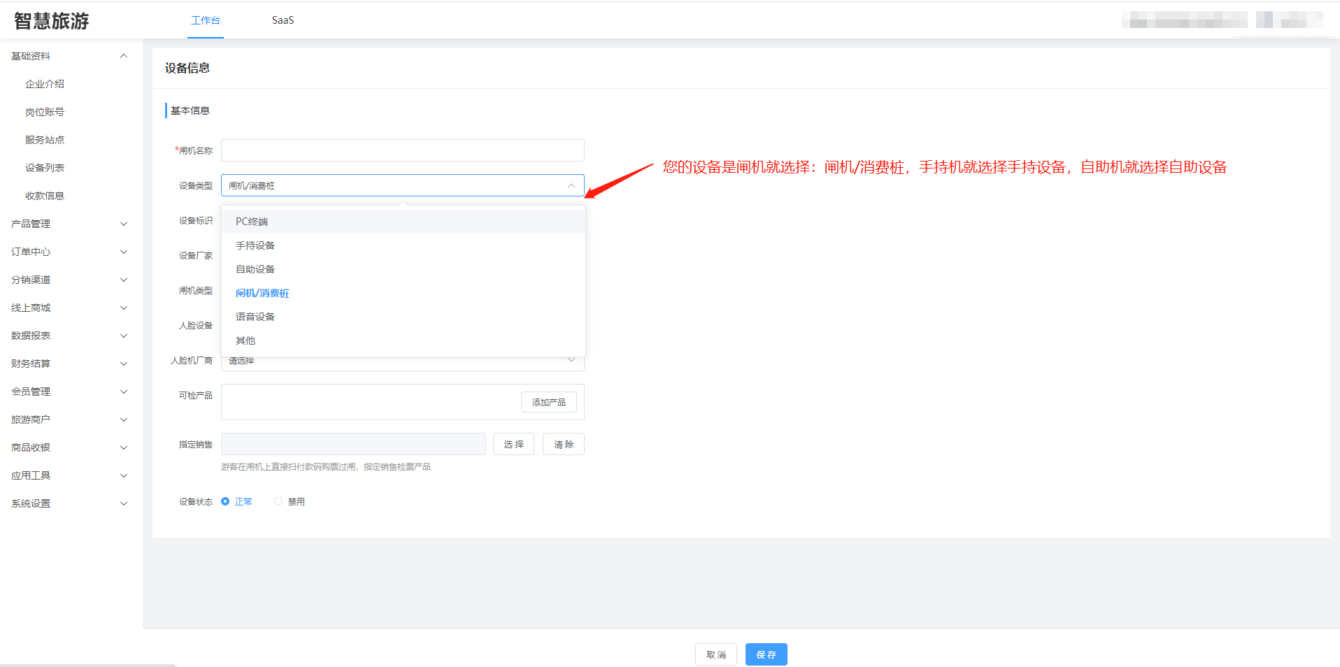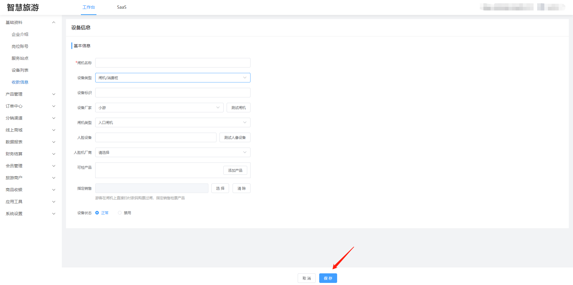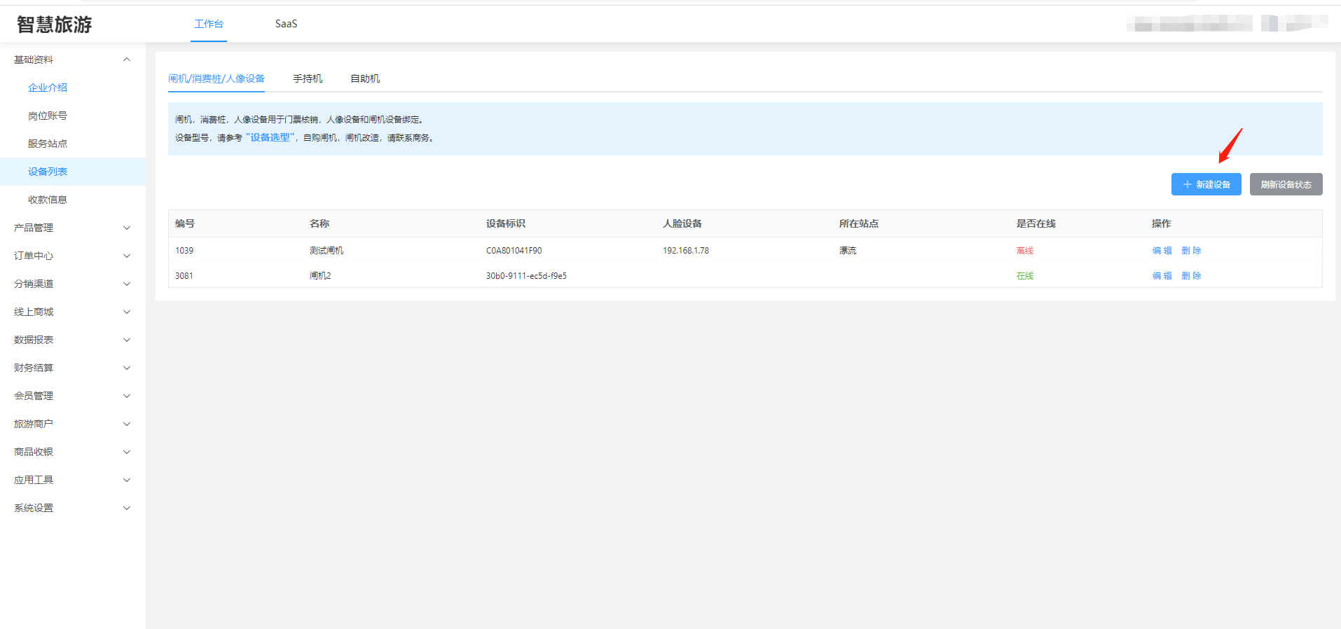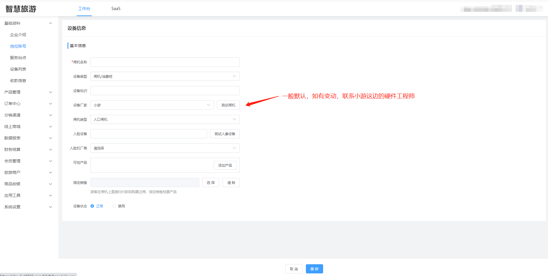 点击基础资料—》设备列表,添加设备  填写闸机的名称  选择对应的设备类型  填写设备标识(也就是闸机屏幕右下角有一串数字)  一般情况下是默认,如果不对就联系小游这边的硬件工程师  摆放着入口的闸机就选入口闸机,放在出口的就选出口闸机  有人脸机的话,就把人脸机右下角那串数字填进来,没有的话就不填  填写完所有的信息以后,一定要记得点下面的保存才能生效!!!