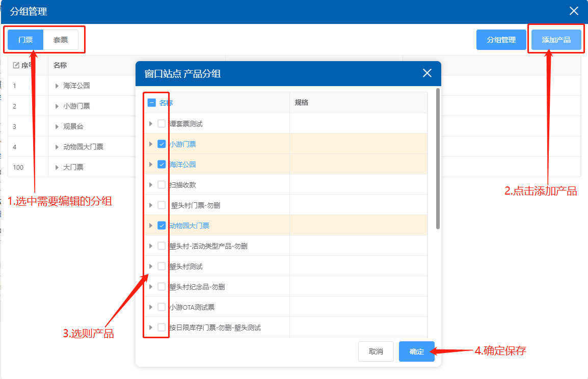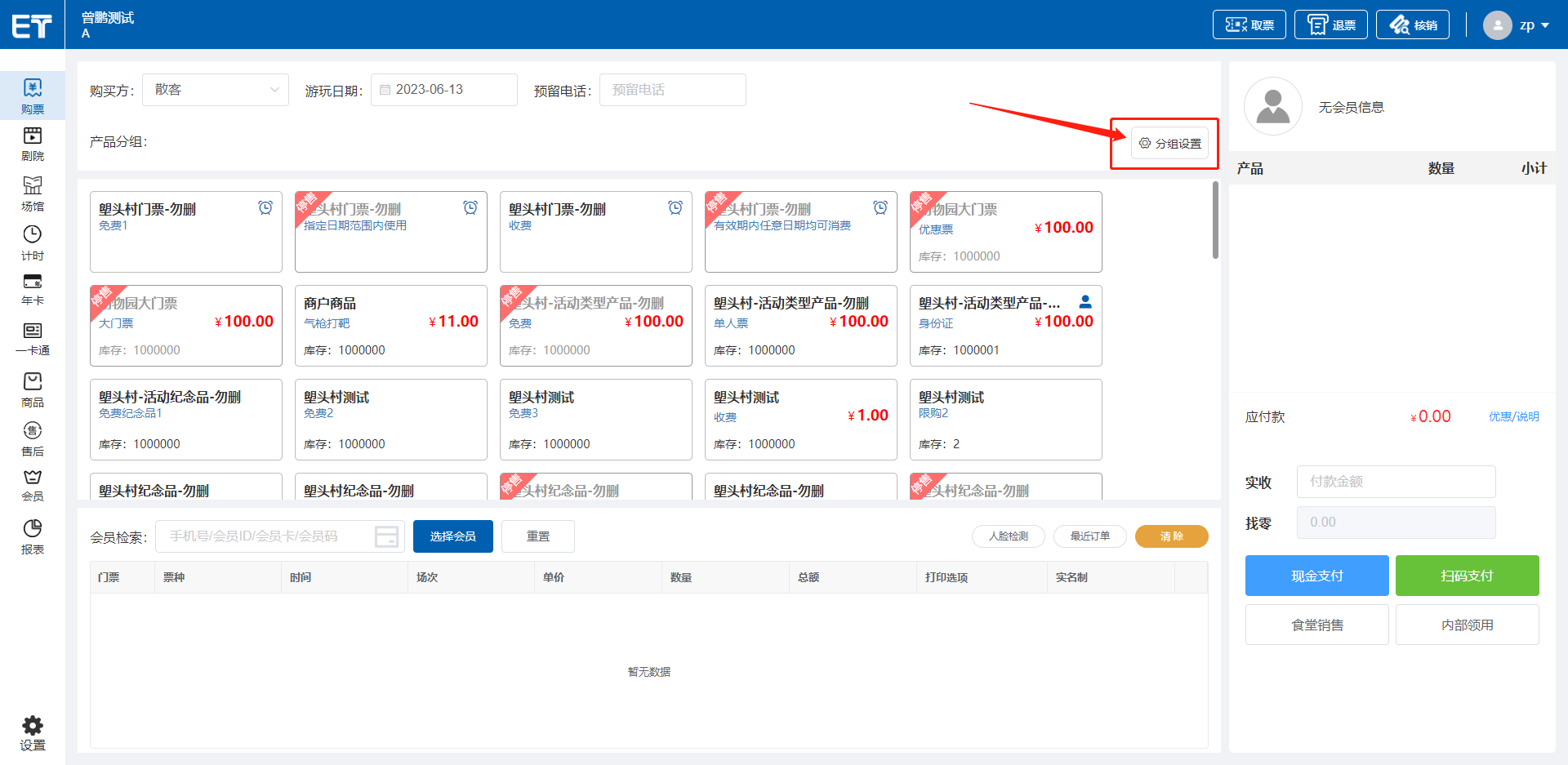 窗口系统进入购票页,并选择分组管理  然后进行添加分组操作  最后进行给分组添加产品操作