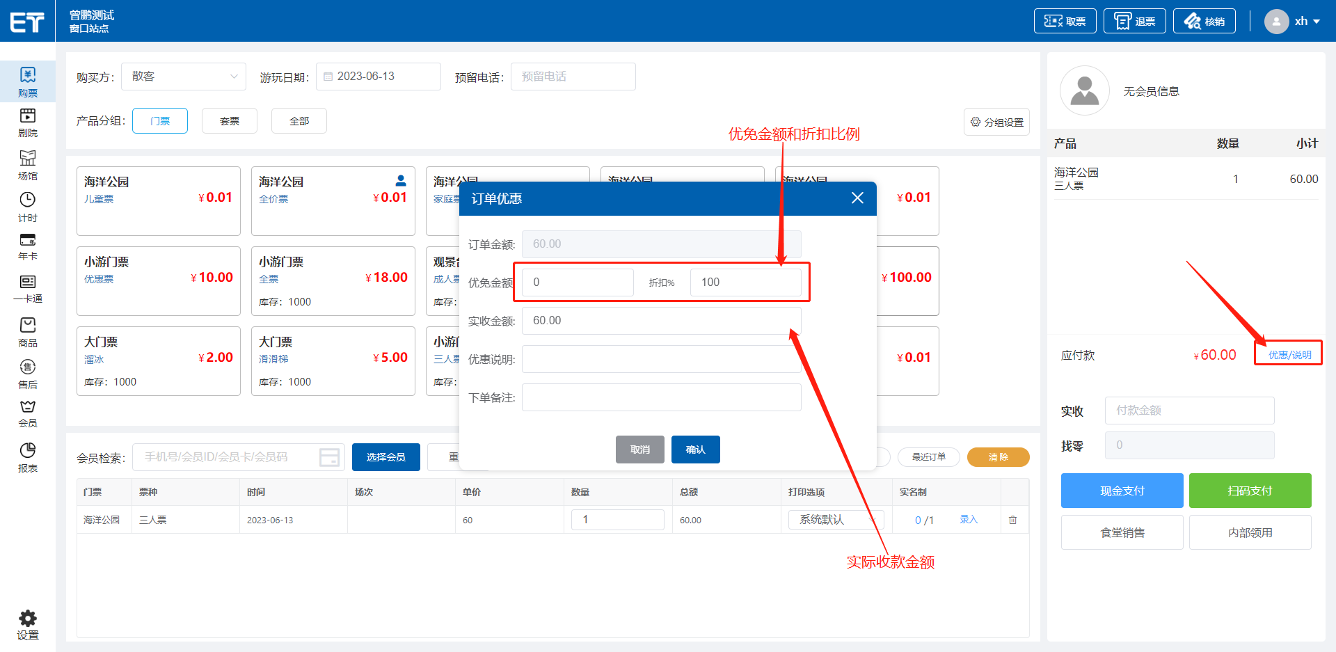 窗口系统选择产品之后,点击右侧 优惠/说明 按钮即可打开优免弹窗 优免金额:优免的金额数值 折扣:进行百分比打折,例如 80为8折(80%),100%为不进行打折 实收金额:最终进行的实际收款