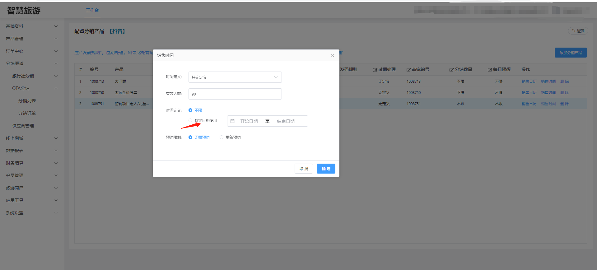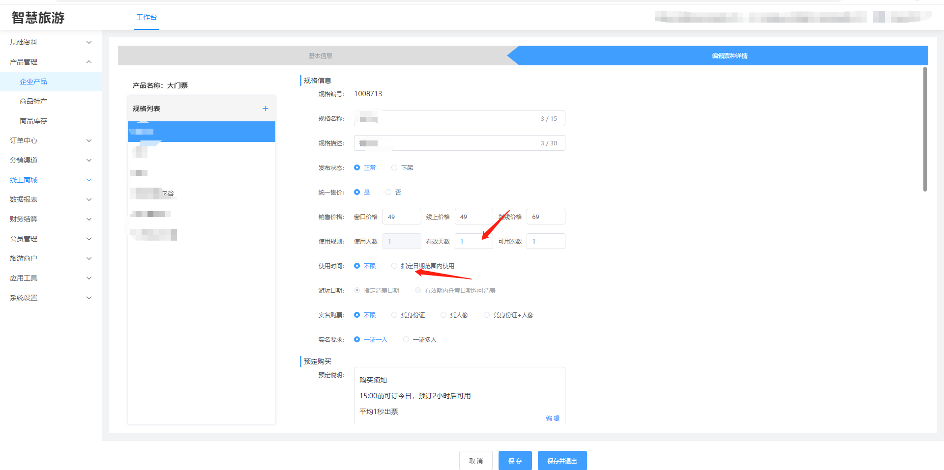 如果是普通的票,在产品管理—》企业产品里,选择这张被提示了的票,点击编辑  查看使用时间。如果设置了指定日期范围内使用。就说明这张票只能在这个时间里使用。不能早于这个时间,也不能晚于这个时间。同时如果设置了指定日期范围内使用,就也要设置有效天数,这个有效天数就是:您设置的这个时间范围的差值。如果你没有设置有效天数的话,默认就是一天(例如:你指定6月13日到6月15日时间范围内使用,但是你只设置了有效天数1天,所以就只有6月13日这天有效。所以如果要达到你的预期,你就需要将有效天数设置3天)  如果是抖音,美团,携程等上的票,在分销渠道——》OTA分销——》分销列表  点击销售时间,查看是否设置了特定日期使用。如果设置了指定日期范围内使用。就说明您设置的这个时间期限就是这张票只能在这个时间里使用。不能早于这个时间,也不能晚于这个时间。同时也要设置有效天数,这个有效天数就是:您设置的这个时间范围的差值。