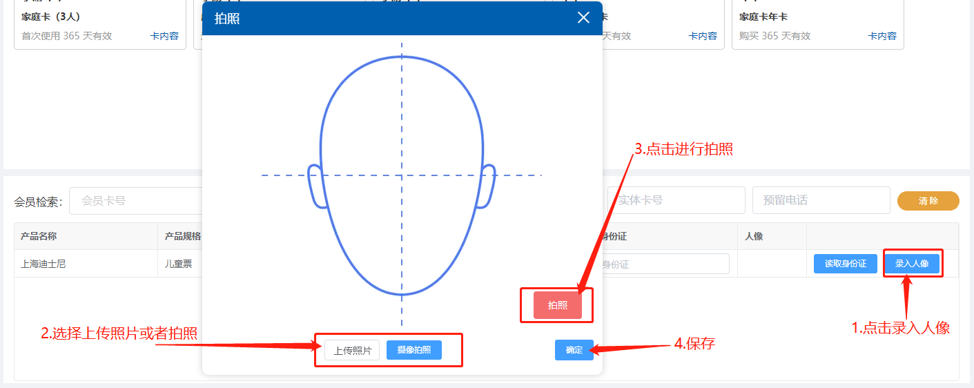 选择年卡产品后填写如下信息 实体卡号和预留电话至少填写一项  人脸录入