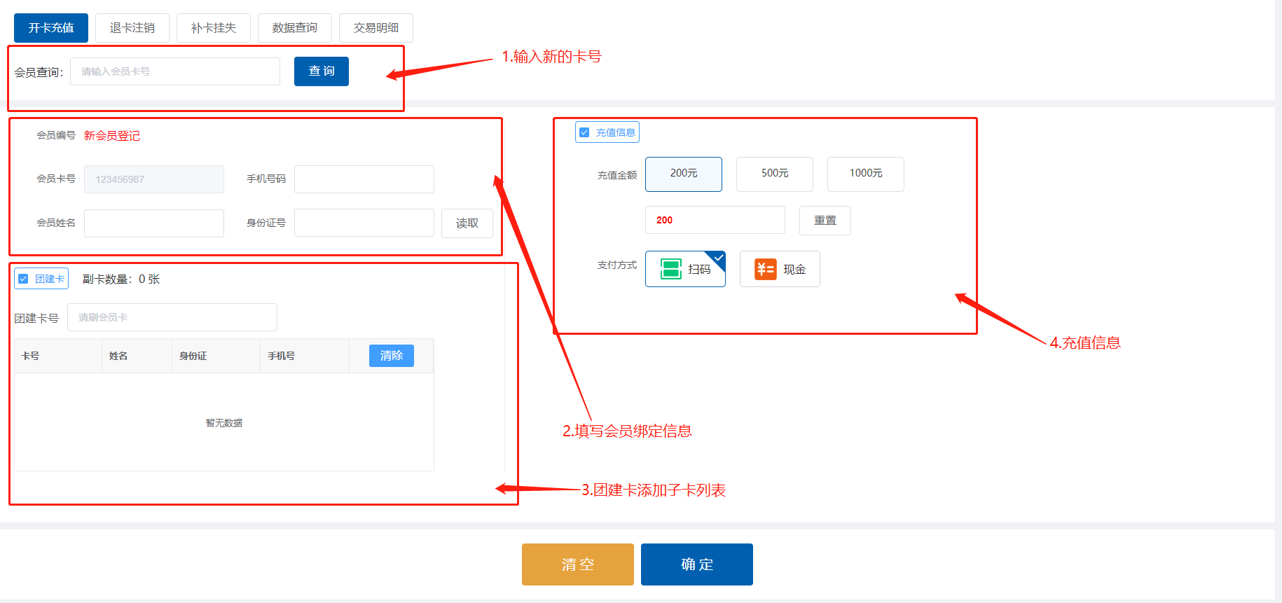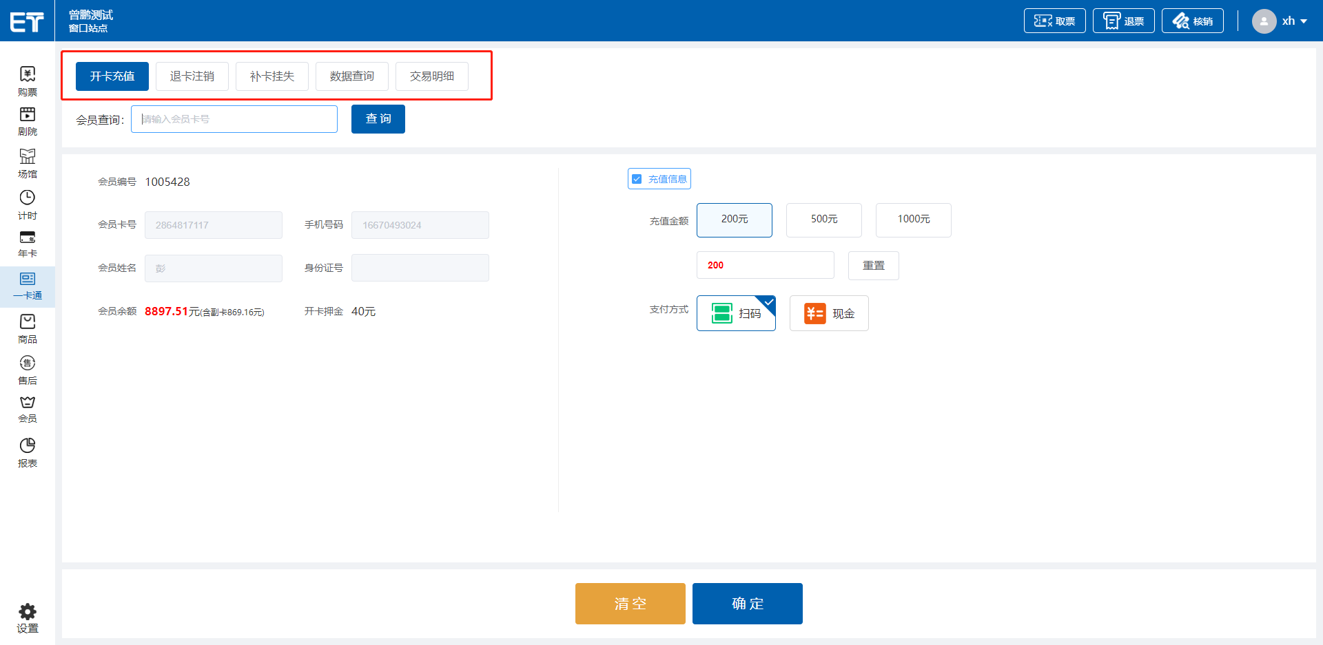 一卡通是会员进行 建卡、充值、补卡、注销 一系列操作的集合页 数据查询:查询会员详细信息 交易明细:查询会员交易记录  新建会员卡