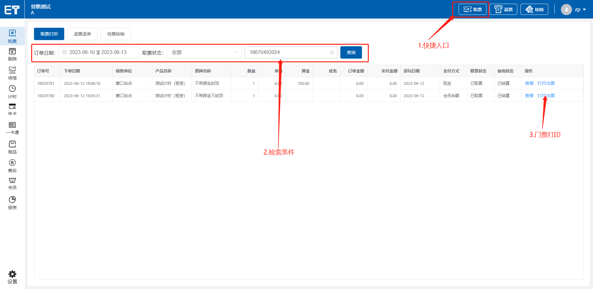 游客入园时没有带相关凭证无法入园时,可使用取票功能打印纸质门票过闸