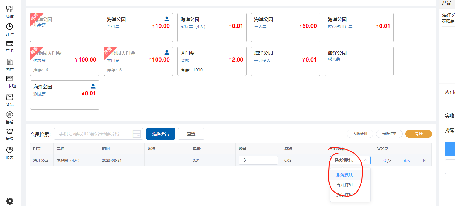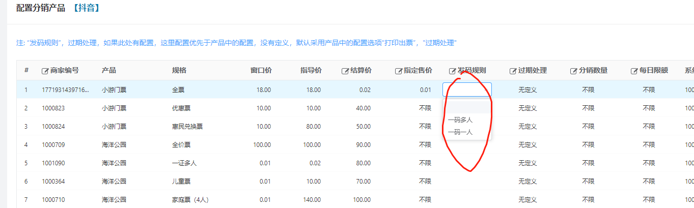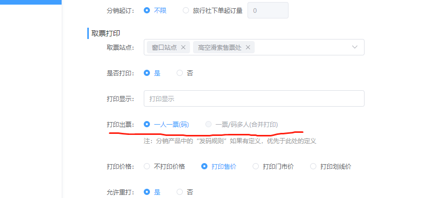 票务系统中,打印出票(发码)方式,根据不同的场景,有: A、合并打印出票,订单中多个数量,合并打印一张票上,也称为一票(码)多人 B、拆分打印,订单中多个数量,分为多张票打印出票,也称为一票(码)一人 设置方式如下 #### 一、在产品设定中  #### 二、窗口售票时,设定打印出票方式  #### 三、针对分销,OTA,在分销产品中设定  #### 四、OTA下单接口中确定打印出票方式 需要技术对接配合,提供相应的接口规范 注意: 1、打印出票纸质票和电子码功能等效 2、小程序商城,旅行社,OTA,下单付款成功后必须产生了相应的电子码,返回给相应的销售渠道, 如美团,抖音或其他平台,所以,一单预定成功后,出票方式不可更改; 3、对于团体出票的,如果是合并打印出票,可以采用核销一次通行一人,没有用完的,可以退票
