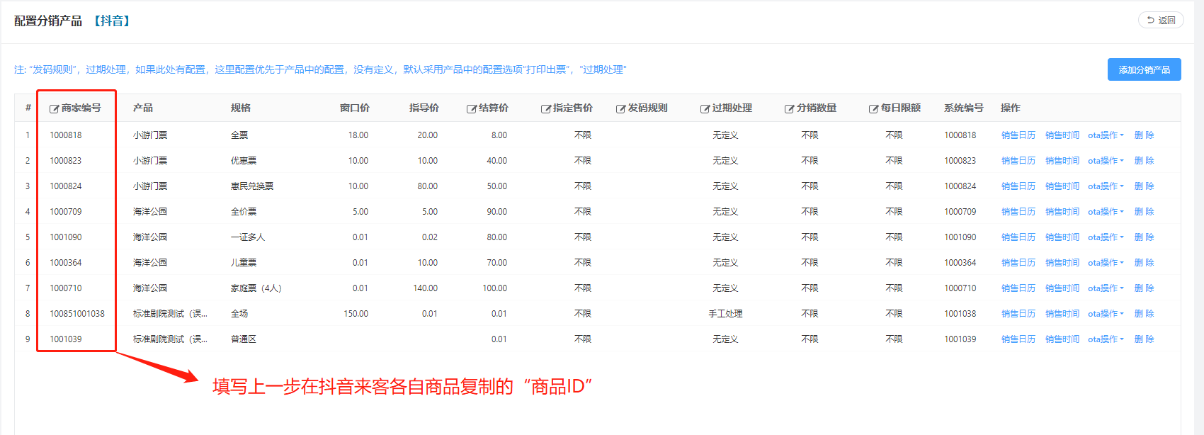 **抖音对接方式有两种,看景区的选择** #### 1、系统接入抖音来客需要抖音授权(http://doc.et0731.com/doc/12/) 这是授权的步骤 (http://doc.et0731.com/doc/20/) 这个是授权之后抖音分销商品上架步骤 ##### 2、直接在抖音来客上发布商品(或者是已发布的商品)然后在配置到票务系统里 ##### == 当前以下操作步骤 是直接对接抖音步骤== ##### 两者的优势以及劣势: ##### 第一种: ##### 优势:票务系统可以接收所有抖音的订单(包括售卖,核销,退订) ##### 劣势:还未对接系统时,已在抖音来客上发布好了的商品,需要先下架把抖音卷改为商家卷重新上架(销售数量会重新从0开始计算) ##### 第二种: ##### 优势:还未对接系统时,已在抖音来客上发布商品不需要修改,根据文档可以直接对接好,可以不影响在抖音来客上商品的销售数量 ##### 劣势:票务系统只能接收到抖音顾客已核销的订单(销售,退订不能在系统中查看) ### 一、登录抖音来客 https://life.douyin.com/p/login  ### 二、抖音来客上发布产品  发布完产品之后,点击保存  **请记住并复制以上截屏商品的“商品ID”,后续需要填写到票务系统中用** ### 三、进入智慧旅游系统,上架抖音需要分销的产品    商家编号这里填写  **商家编号:**填写上一步骤中抖音来客的“商品ID” 点击保存  ==注意:对接好了之后,销售、退订订单不会在票务系统中显示,订单核销之后的才会显示在票务系统中( 订单不能退,不能撤销核销,不能做任何操作)==