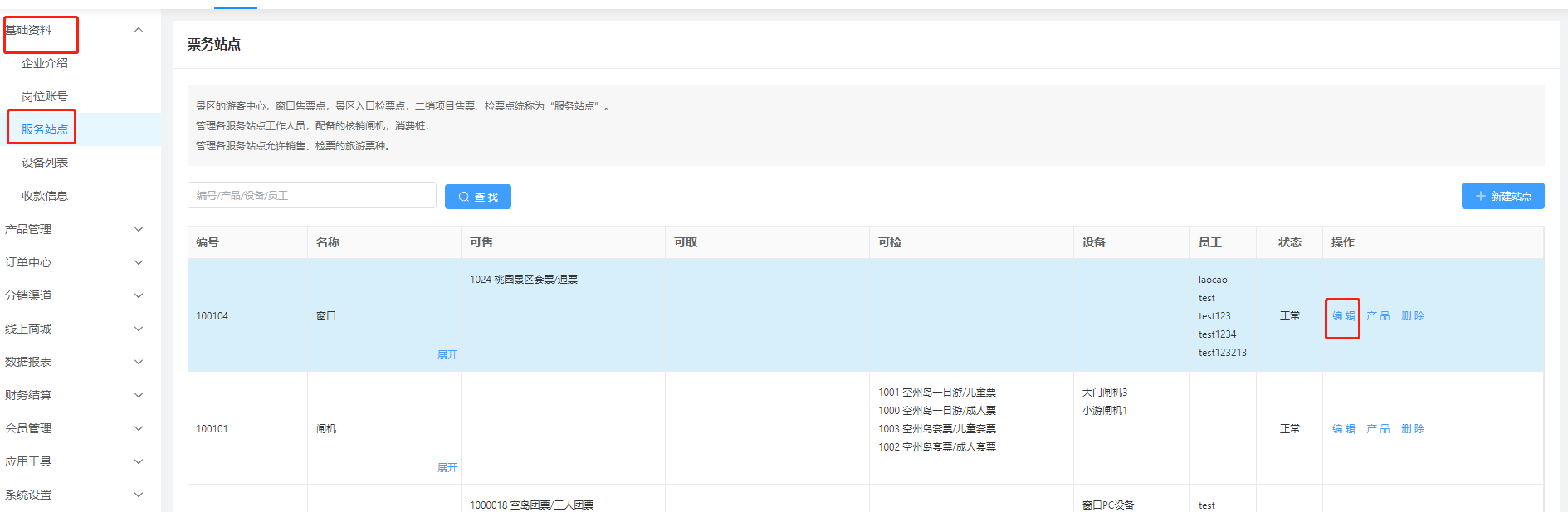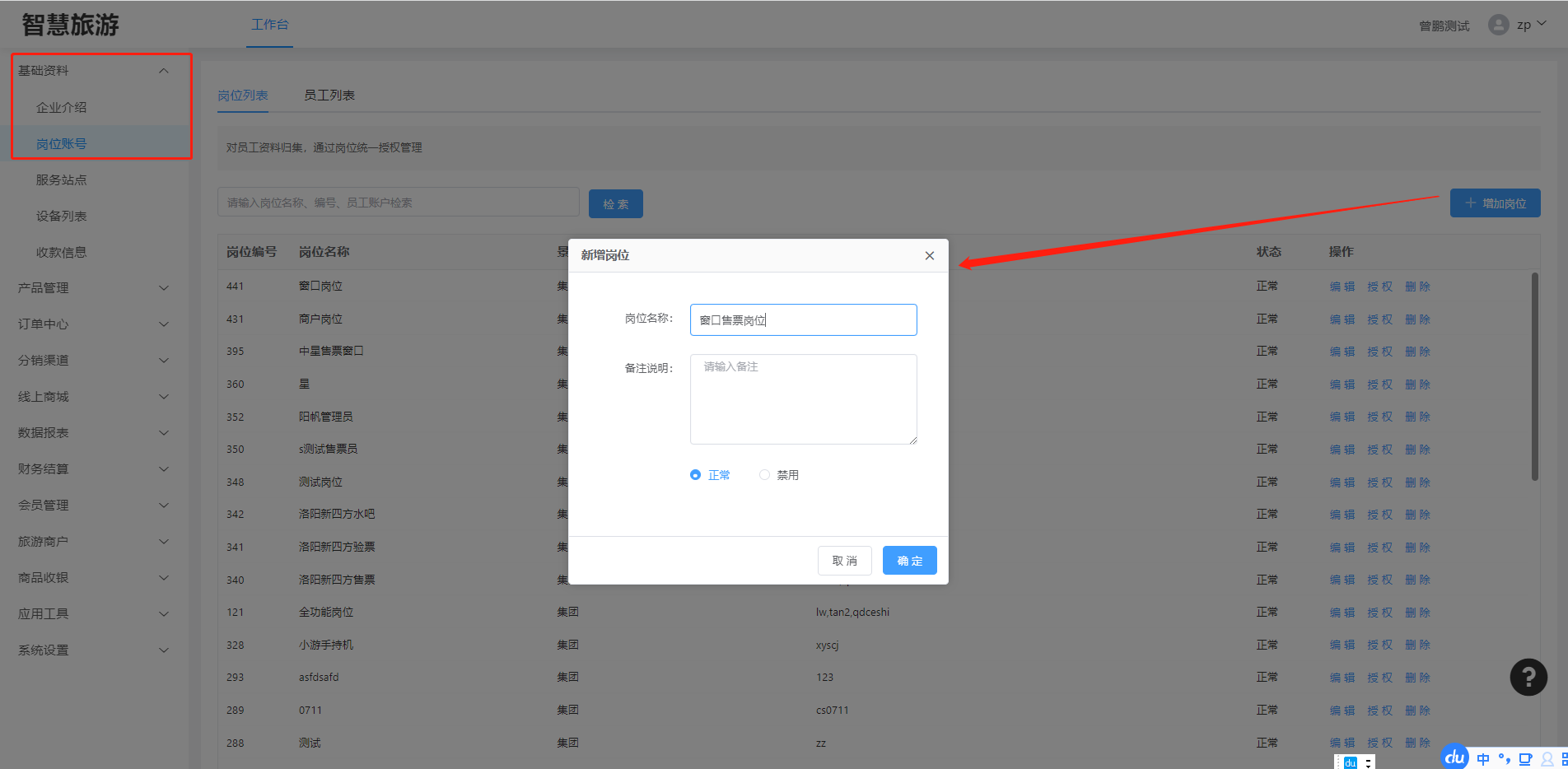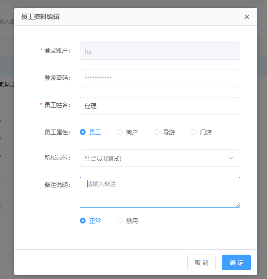 ## 一、管理后台的授权操作 ### 概述、为(景区/园区)管理人员和工作人员(售票/检票)建立岗位和登录帐号 #### 1、建立岗位信息 登录管理后台->工作台->基础资料->岗位账号->岗位列表  点击“添加岗位”,填写响应的名称和说明,点击确定保存岗位信息。  #### 2、对岗位授权 选择需要授权的岗位(例如:售票岗位,财务...),点击“授权”,进入授权操作。  #### 3、建立登录用户 登录管理后台->工作台->基础资料->岗位账号->员工列表  #### 登录帐户以英文加数字组成(例如:ysspy001,ysjpy001....)  ### 二、设置员工工作站点(例如:售票窗口) ##### 详解:员工可以在哪里服务站点进行工作,是在服务站点中授权管理。 #### 1、进入服务站点管理  点击编辑,进入该服务站点的管理页面 #### 2、添加授权员工  在授权员工处添加相应的员工账号。 #### 3、测试登录售票窗口 进入售票窗口软件,登录处,填写用户账户,如果你填写的账户是合法存在的,服务站点列表中,会自动显示该账户允许登录的服务站点