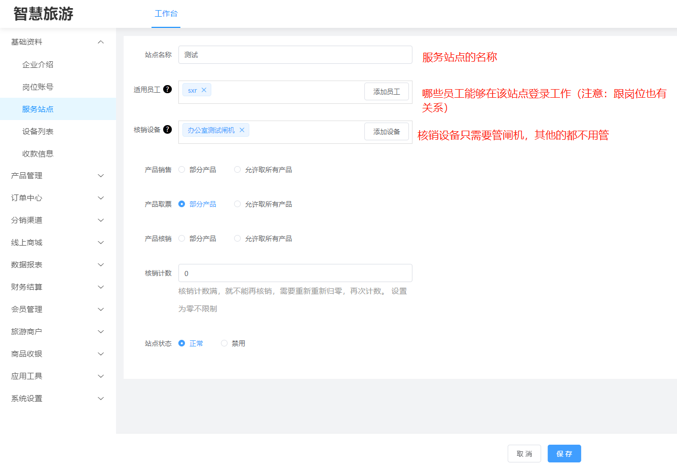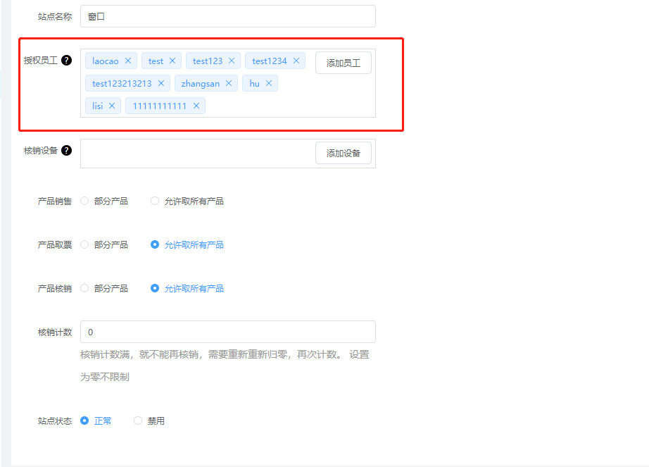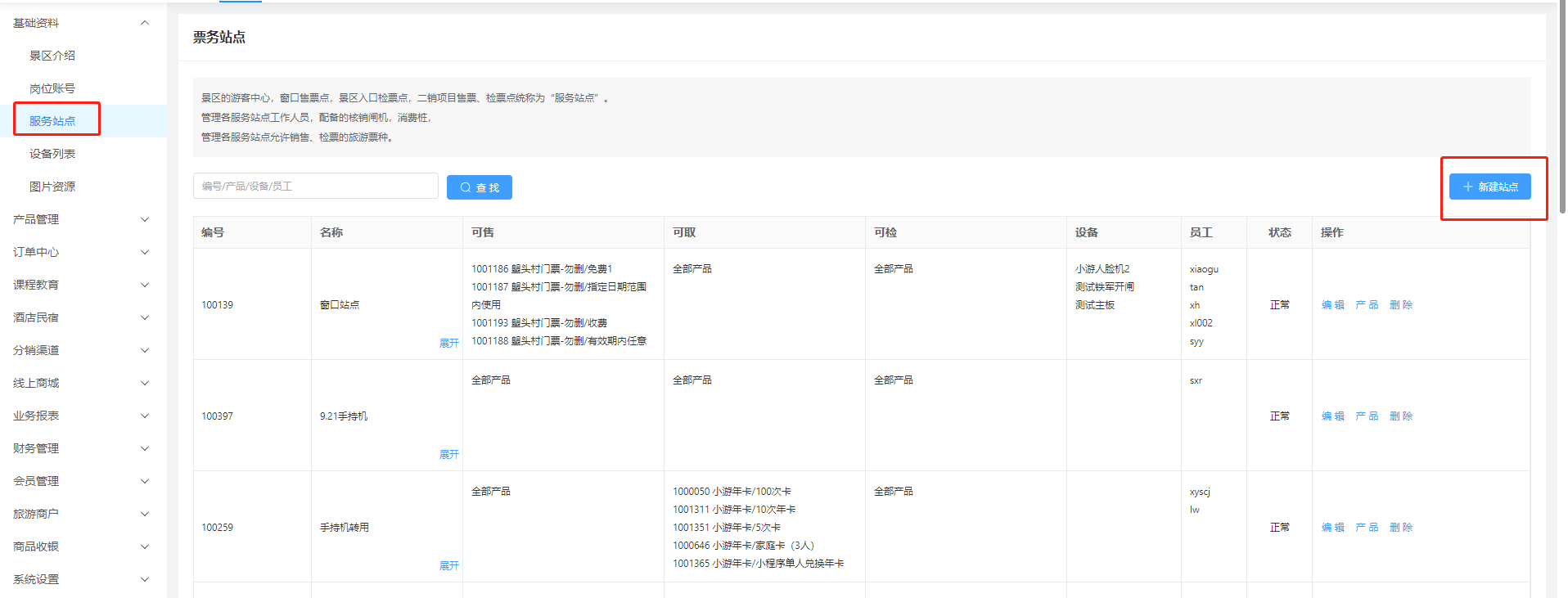 ### 一、概述 **服务站点的详解**:服务中心,一个售票点,检票点,这些可以看做是一个服务站点。 **例如**:卡丁车是一个二销项目,那里景区员工拿着一台手持机进行售票和检票这个就可以看做是一个站点,自助机可以售票和取票这也可以看做是一个站点。 **注意**:一个员工帐号最好是在一个站点里面进行工作,这样方便溯源数据。 #### 服务站点里面主要的工作(售票,取票,检票,退票)的操作。 ==注意:服务中心是系统初始化自带的一个站点(默认能够取所有的票种)。== ### 二、服务站点操作 #### 1、工作台->基础资料->服务站点  #### 2、新建站点  #### 3、设置该站点(员工工作)(票种的售,核销,取票,退票)(闸机的添加)。  #### 4、将员工股帐号添加到服务站点里面去  #### 4、服务站点(可售,可取,可检)产品设置 **可售:**展示该站点可销售(售卖)哪些产品门票 **可取:**展示该站点可取(换区纸质票)哪些产品门票 **可检:**展示该站点可核销(检票)哪些产品门票  **可销售产品:**设置该站点是否可以部分产品销售,还是允许所有产品的销售 **可取票产品:**设置该站点是否只能取一部分的票,还是允许取所有产品的票 **可核销产品:**设置该站点是否只能核销一部分的票,还是所有的产品都可以核销  ### 三、窗口售票人员登录‘服务站点’进行操作 #### 1、输入正确账户名称,下拉框里面就会出现‘服务站点’的名称。 #### 2、网络一定要通畅,要不然是不会出现‘服务站点’的。 #### 3、员工帐号一定要保证已经加入到了‘服务站点’里面了。