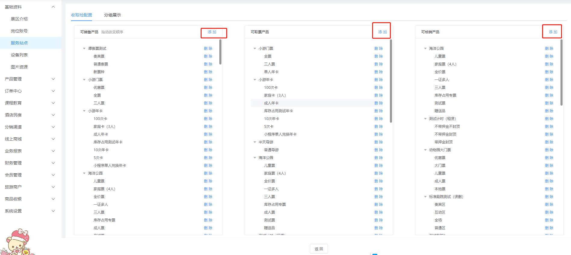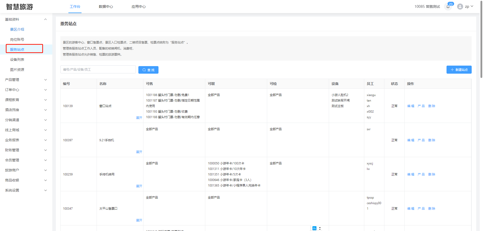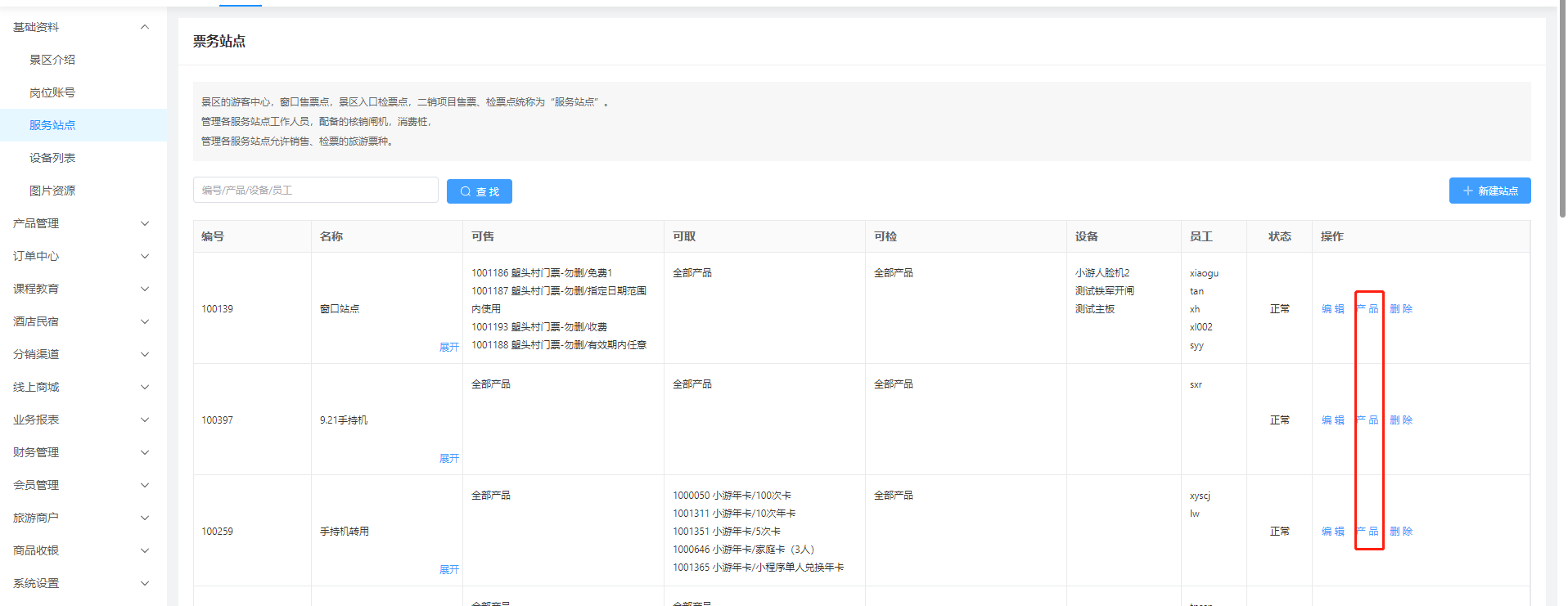 ### 一、概述 **服务站点的详解**:服务中心,一个售票点,检票点,这些可以看做是一个服务站点。 **例如**:卡丁车是一个二销项目,那里景区员工拿着一台手持机进行售票和检票这个就可以看做是一个站点,自助机可以售票和取票这也可以看做是一个站点。 **注意**:一个员工帐号最好是在一个站点里面进行工作,这样方便溯源数据。 #### 服务站点里面主要的工作(售票,取票,检票,退票)的操作。 ==注意:服务中心是系统初始化自带的一个站点(默认能够取所有的票种)。== ### 二、服务站点操作 #### 1、工作台->基础资料->服务站点  #### 2、新建站点  #### 3、设置该站点(员工工作)(票种的售,核销,取票,退票)(闸机的添加)。  #### 4、将员工股帐号添加到服务站点里面去  #### 4、服务站点(可售,可取,可检)产品设置 **可售:**展示该站点可销售(售卖)哪些产品门票 **可取:**展示该站点可取(换区纸质票)哪些产品门票 **可检:**展示该站点可核销(检票)哪些产品门票  **可销售产品:**设置该站点是否可以部分产品销售,还是允许所有产品的销售 **可取票产品:**设置该站点是否只能取一部分的票,还是允许取所有产品的票 **可核销产品:**设置该站点是否只能核销一部分的票,还是所有的产品都可以核销  ### 三、窗口售票人员登录‘服务站点’进行操作 #### 1、输入正确账户名称,下拉框里面就会出现‘服务站点’的名称。 #### 2、网络一定要通畅,要不然是不会出现‘服务站点’的。 #### 3、员工帐号一定要保证已经加入到了‘服务站点’里面了。
