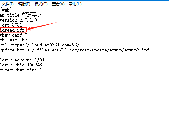### 身份证窗口调试 #### 1、先下载好售票软件窗口,下载后可以联系票务系统这边,会给您提供一个驱动  #### 2、下载好驱动后保存,然后点击窗口售票软件,右键选择“打开文件所在位置”  #### 3.打开文件复制或者拖动之前保存的那个驱动文件到窗口的根目录,选择“替换目标中的文件”   #### 4.替换后,双击根目录里面的“ETWindowCloud.ini”文件,参数显示是“idread=idr”就是正确的,不是显示这个的就改成这个,然后保存关闭   #### 5.最后就可以打开窗口去录入身份证信息了