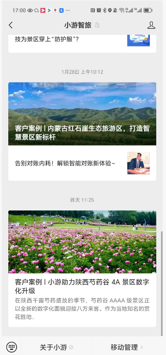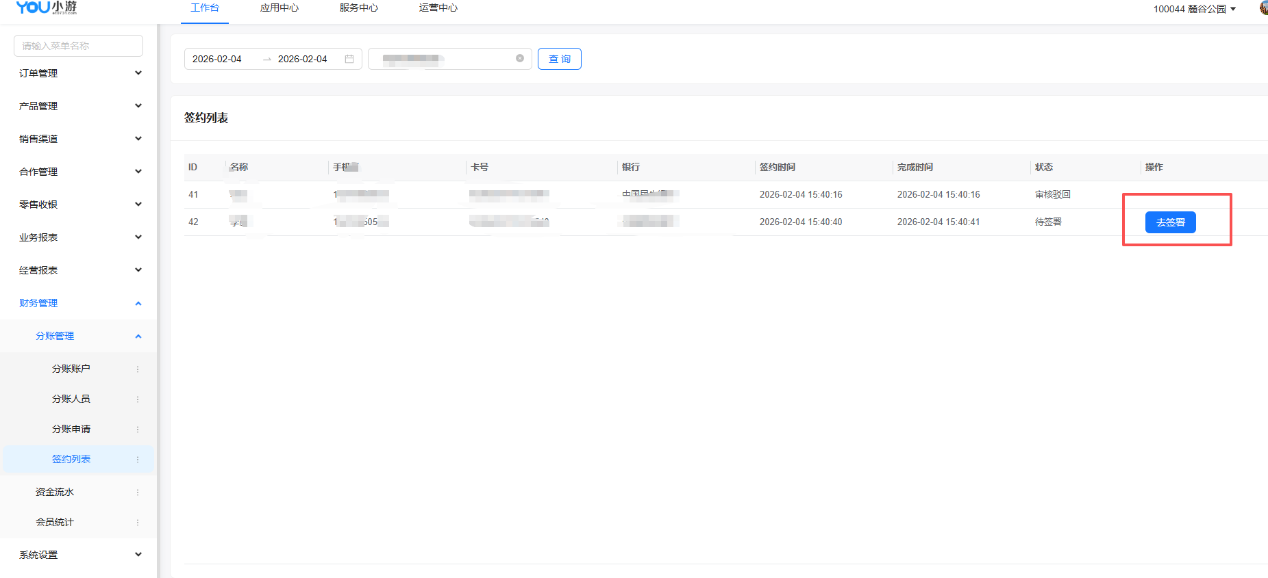 #### 1、公众号搜索“小游智旅”,选择“移动管理--移动管理后台”  #### 2、输入账号、密码进行登录  #### 3、选择需要登录的景区或者门店  #### 4、点击商户资产  #### 5、此处展示合作的景区或门店,如果有补齐资料按钮,需要去填写资料 补齐资料有两种, 5.1、在平台未填写过银行信息 5.2、填完入账信息还未签约 #### 5.1、在平台未填写过银行信息, 选择打款方式,“对公”或“对私”  ##### 5.1.1、对私需要填写,姓名,手机号码,身份证号,银行卡号,银行名称,注:手机号码需要填写银行预留的手机号码,填写完成提交审核   如图:提示入账方已存在,需要重新填写资料  #### 5.2、填完入账信息还未签约,需要到第三方平台签约,点击查看详情  点击去签署  此状态表示本人已经签约,需要分账方管理人员在票务后台进行签约  票务后台签约步骤,如图: