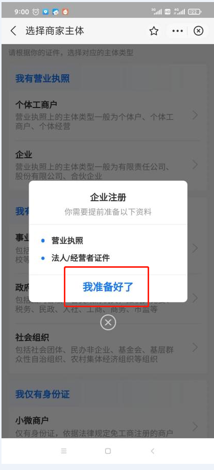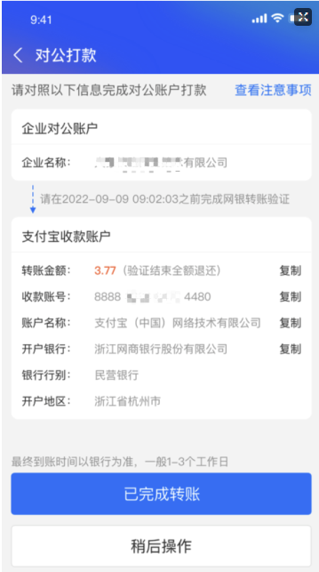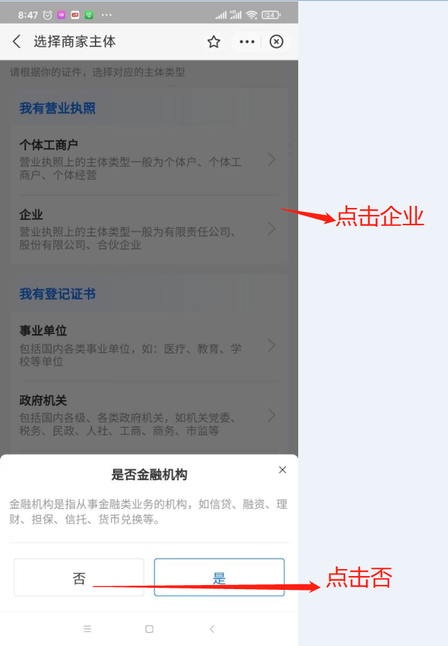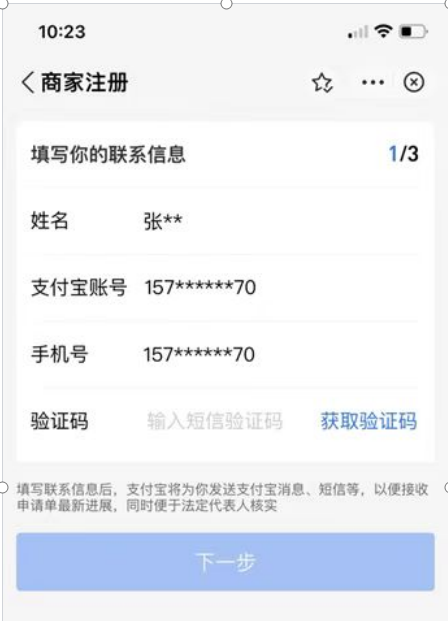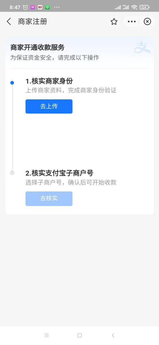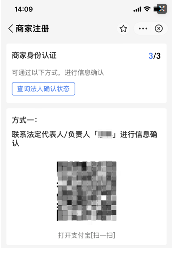 ## 1. 支付宝商家认证”简介 基于系统风控、用户资金安全方面的考虑,同时携手服务商伙伴更好地服务商家数字化升级,支付宝将升级间连进件商家身份信息识别和认证标准。`客服电话 95188` ## 2.名词解释 **1、法定代表人:**企业营业执照上的法定代表人、个体工商户营业执照上的经营者、小微商户经营者等(在下文统称为“法人”)。 **2、联系人:**可以是实际经营者、门店负责人、店员、财务等,必须是商家指定联系人。联系人支付宝实名的身份证号需要与提交商家认证申请时的联系人身份证号一致 ==操作步骤如下:== ## 1.、扫描以下二维码  ## 2、点注册新商家  ## 3、点击去上传  ## 4、选择企业后,点击否  ## 5、点击我准备好了  ## 6、填写你的联系信息,支付宝账号与手机号要一样,才能接收到验证码,然后按要求,上传营业执照、法人身份证正、反面等  ## 7、完成联系人信息后,不是企业法人,需要法人授权认证,是企业法人,不需要认证。 有以下几个方式让法人授权认证: ==方式一:==法人使用支付宝客户端扫一扫完成授权确认  ==方式二:==通过支付宝发送消息通知法人,法人使用已实名认证的支付宝账号完成授权确认  ==方式三:==使用对公账户汇款来进行授权  企业商家需要使用对公账户往支付宝指定的银行卡号汇入一笔指定金额(0.01 元 ~ 1 元),支付宝会在 T+1 日原路退回汇入的钱款。 汇款完成后可在 2 个小时后进行查询,认证成功后支付宝会发送 商家认证申请审核成功的消息通知。  完成收款账号绑定 *当创建申请单接口中己上传待绑定收款账号列表时,系统自动完成收款账号的绑定。 *当创建申请单接口中未上传待绑定收款账号列表时,联系人可通过推荐或收款账号搜索的方式,选择对应的收款账号完成绑定。  最后收款账号绑定成功,表示支付宝注册已成功。
